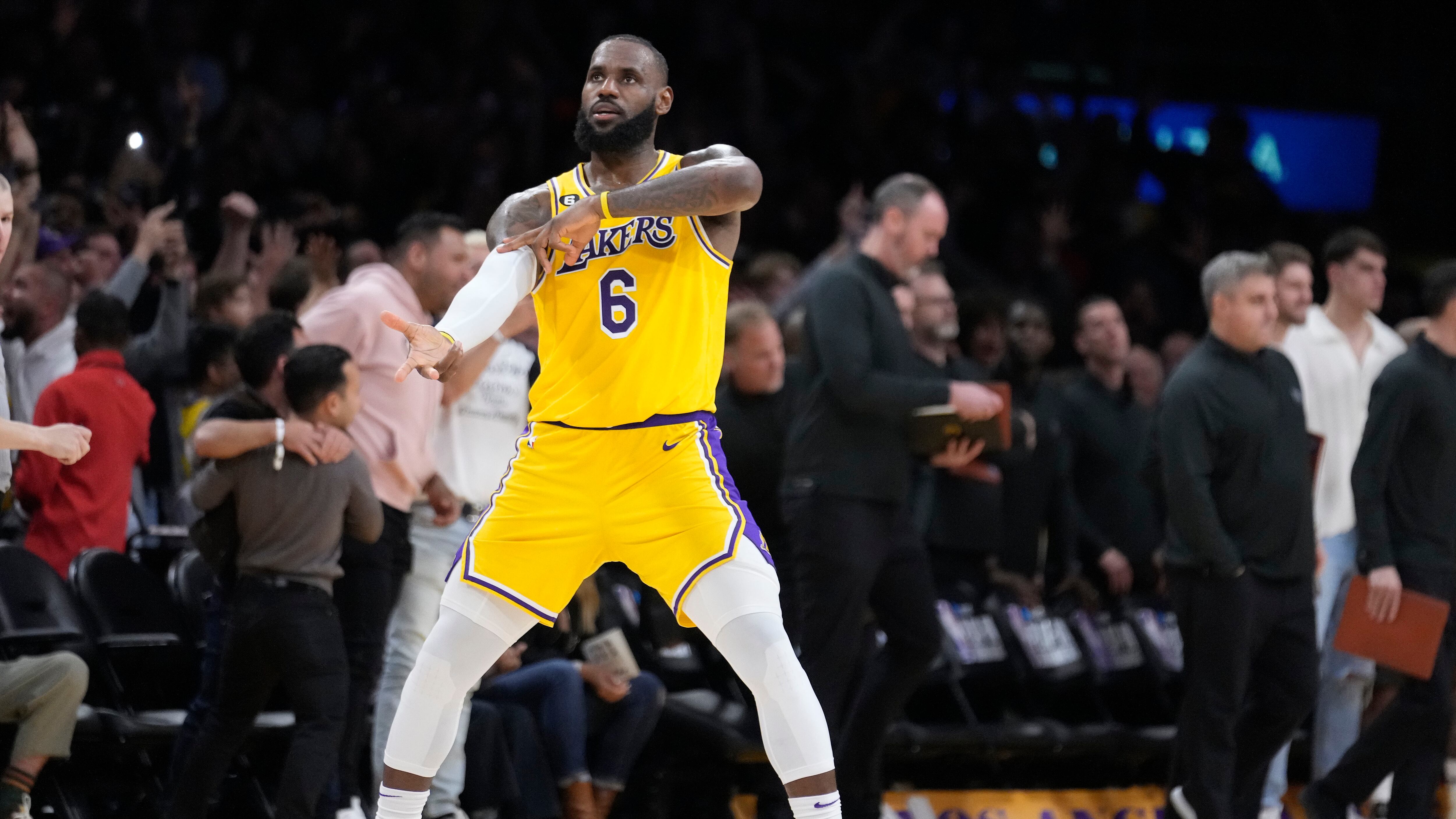 LeBrom James, de los Lakers de Los Ángeles, festeja un triple de Dennis Schröder en el duelo del minitorneo de repesca ante los Timberwolves de Minnesota, el martes 11 de abril de 2023 (AP Foto/Marcio José Sánchez) AP (Marcio Jose Sanchez/AP)
