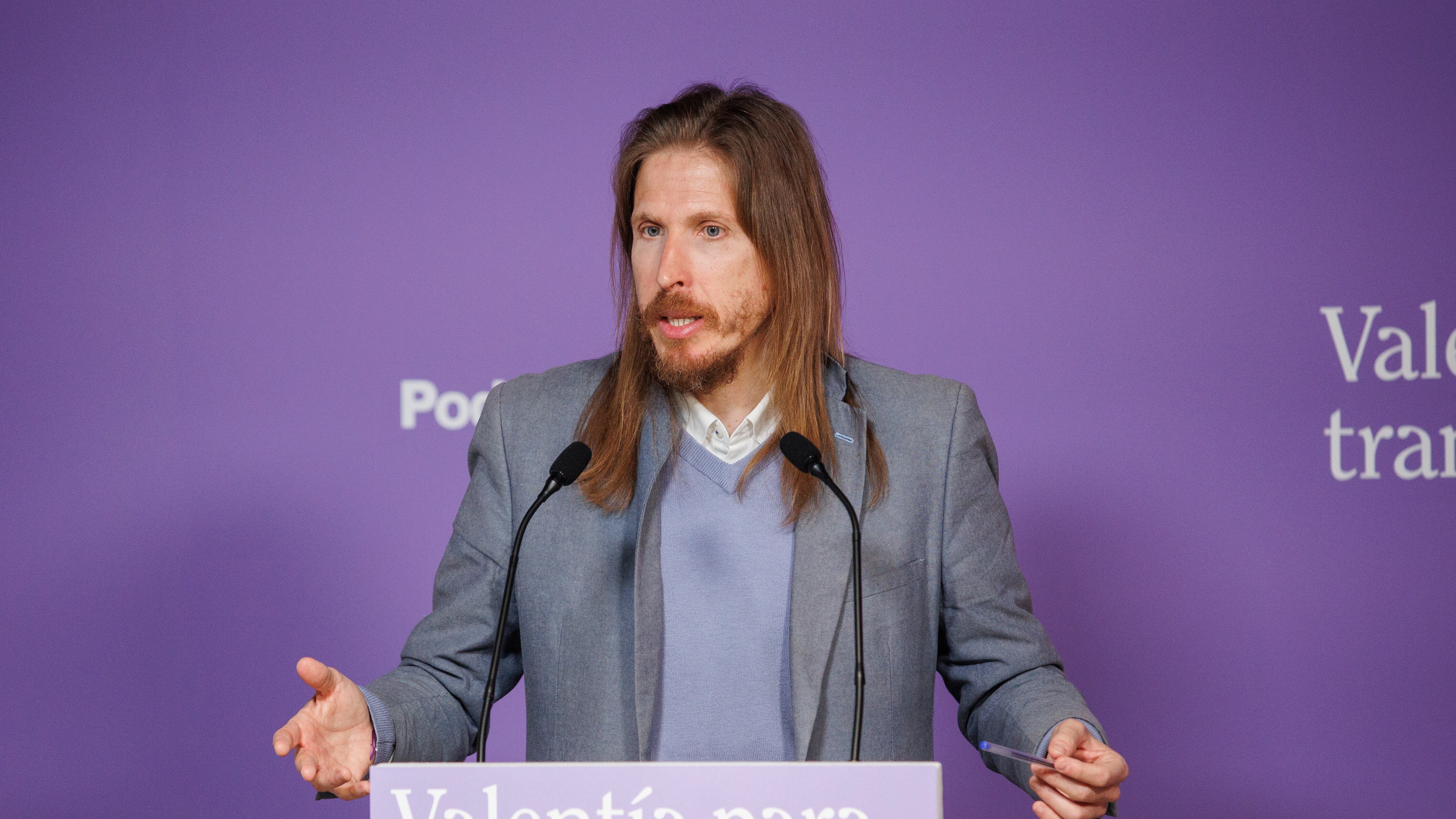 El portavoz de Podemos, Pablo Fernández, durante una rueda de prensa en la sede de Podemos, a 3 de abril de 2023, en Madrid (España). Alejandro Martínez Vélez - Europa Press
