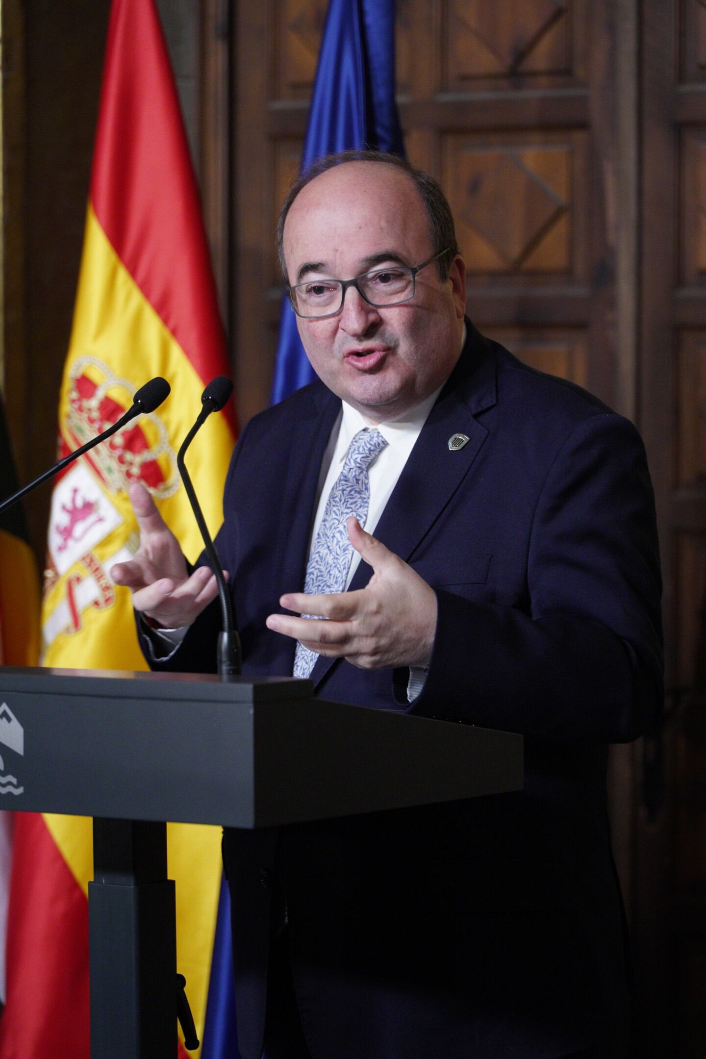El ministro de Cultura y Deporte, Miquel Iceta, ofrece una rueda de prensa durante su visita al Monasterio de Santa María la Real, Nájera, La Rioja (España). Iceta visita hoy la Escuela de Patrimonio Histórico de Nájera (La Rioja) y el Monasterio de Alberto Ruiz - Europa Press (Alberto Ruiz - Europa Press/Europa Press)