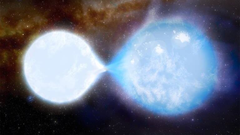 Los investigadores encontraron que las estrellas, ubicadas en una galaxia enana vecina llamada Pequeña Nube de Magallanes, están en contacto parcial e intercambian material entre sí, con una estrella actualmente "alimentándose" de la otra. Se orbitan entre sí cada tres días y son las estrellas en contacto más masivas (conocidas como binarias de contacto) observadas hasta ahora.