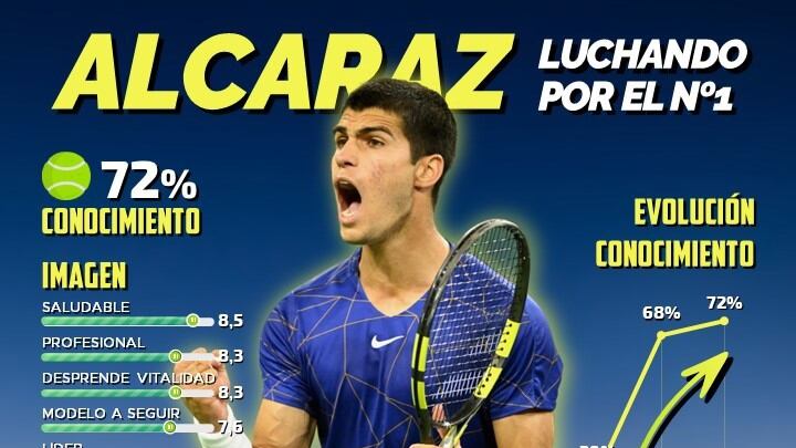Actualmente Alcaraz es conocido por un 72% de la población, alcanzando una evolución de notoriedad donde era conocido apenas por el 29% a finales de 2021. Su imagen alcanza cifras muy destacables en su perfil de imagen, propios de un deportista de éxito: Saludable (8,5), Profesional (8,3), Desprende Vitalidad (8,3), Modelo a Seguir (7,6) y Líder (7,5).