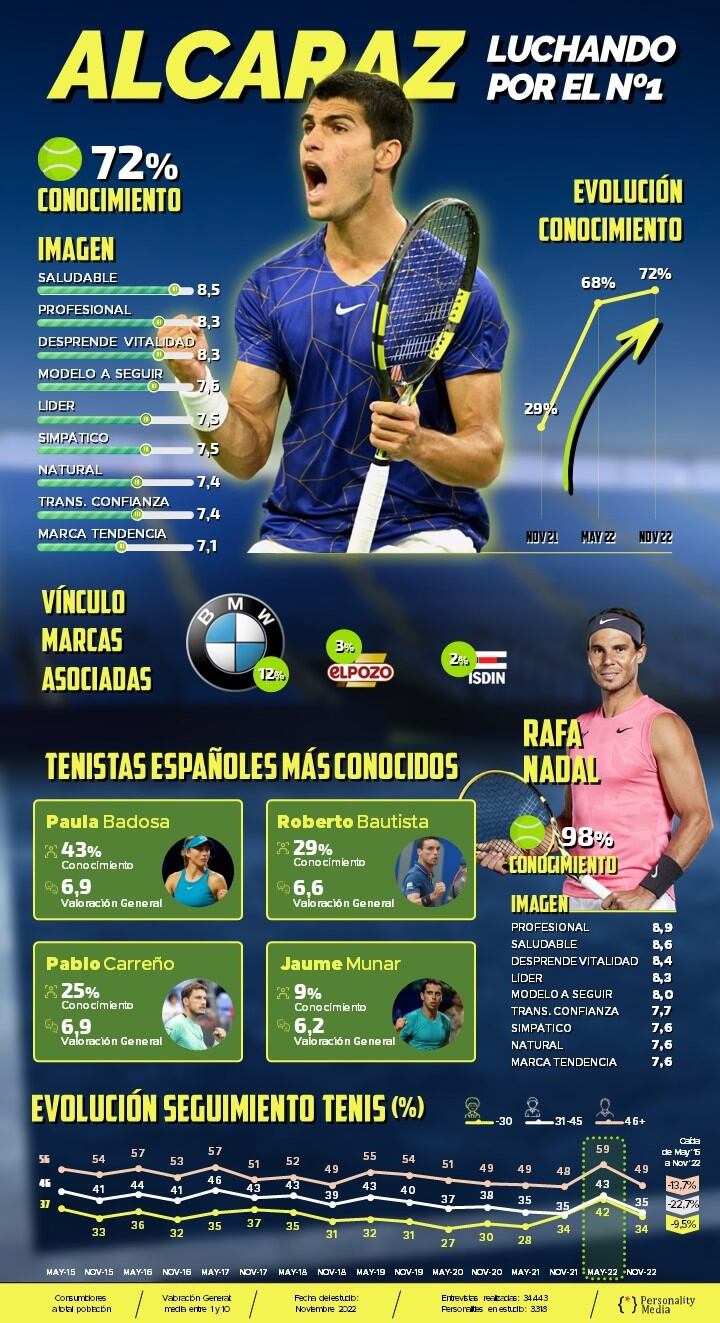 La llegada de Carlos Alcaraz ha despertado un interés fundamental para cualquier deporte. Los éxitos con los que sorprendió a todos los medios han catapultado su imagen. Justo coincidiendo con sus triunfos, vemos un repunte muy relevante a lo largo de 2022 en el interés declarado por los consumidores que siguen el tenis, en especial los jóvenes y los más adultos.