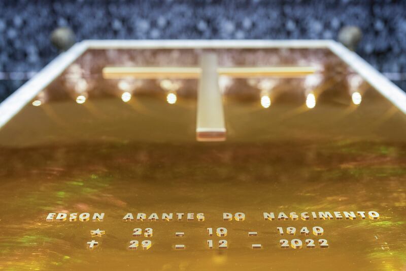 El mausoleo que se construyó para albergar el féretro dorado de Pelé comenzó a recibir visitantes el lunes. En el segundo piso de un cementerio vertical en la ciudad de Santos, en las afueras de Sao Paulo, el mausoleo recibe a los aficionados con dos estatuas doradas de Pelé.