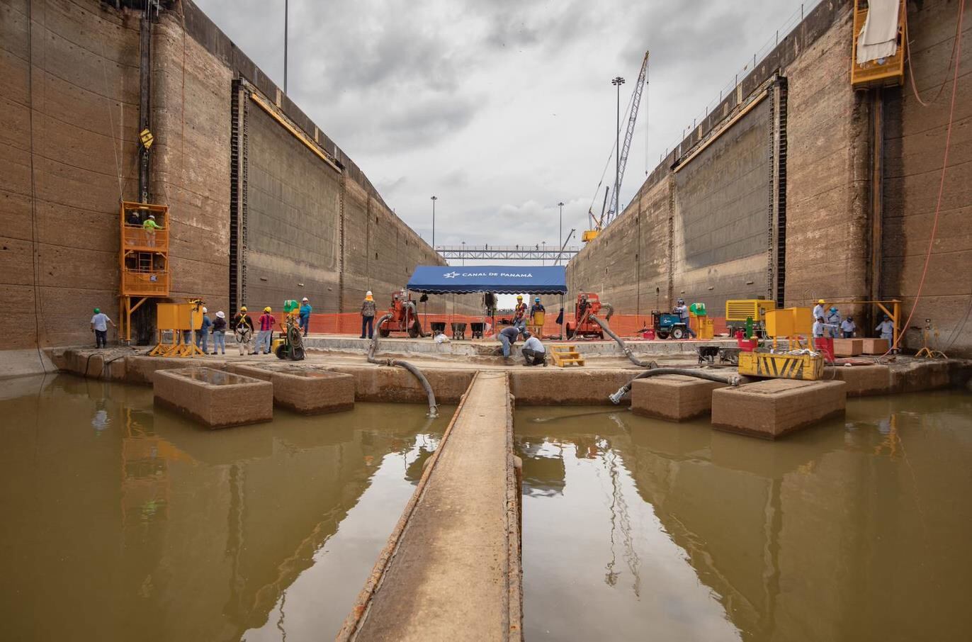 En esta cámara seca trabajan más de 400 personas, todos trabajadores del Canal, en un esfuerzo continuo de 24 horas al día, durante ocho días. Se debe destacar que a lo largo de este periodo de mantenimiento no se interrumpe el tránsito de los buques por las esclusas.