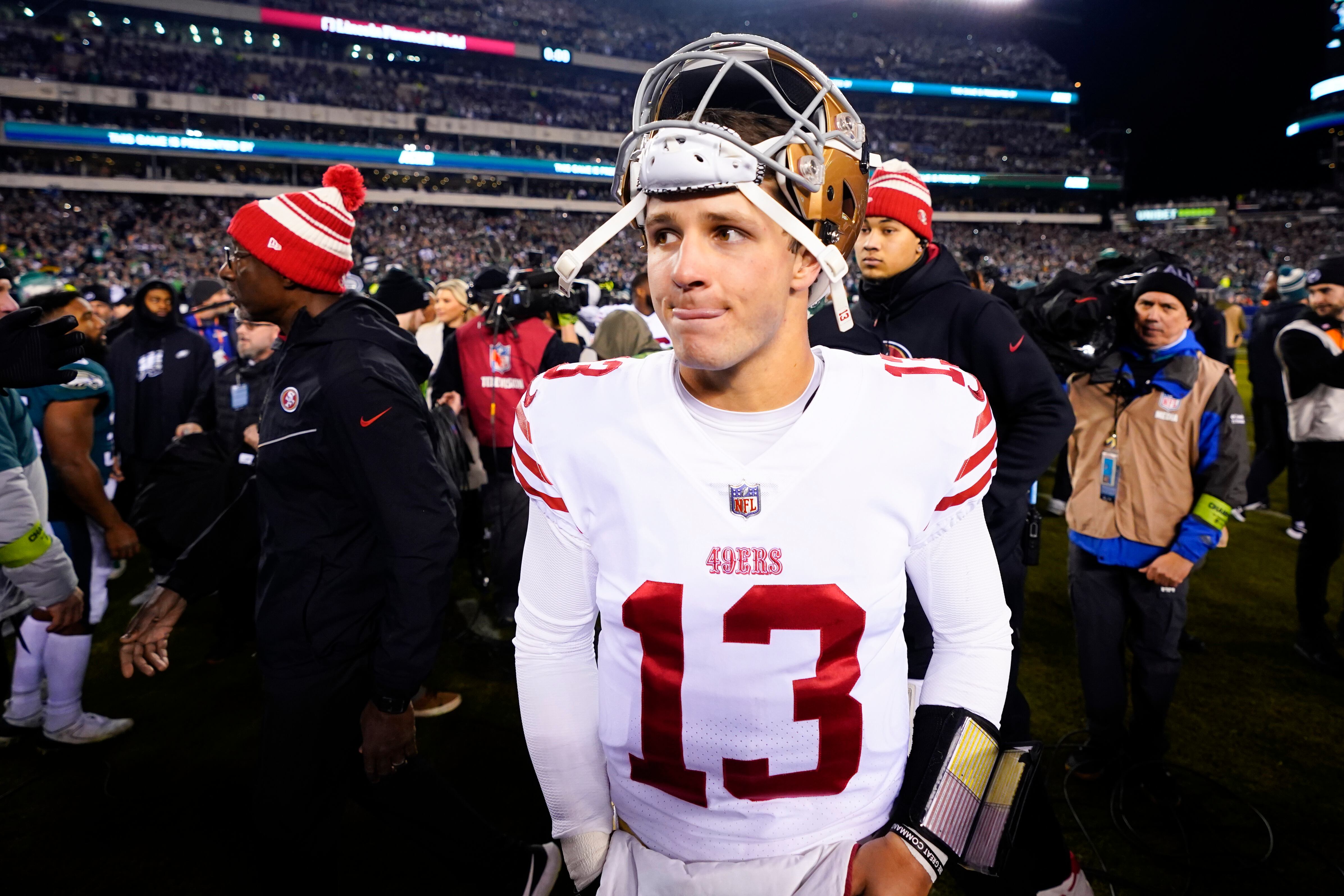 San Francisco puso al corredor Christian McCaffrey a calentar el brazo durante el juego de campeonato ante Filadelfia, esto después de que Brock Purdy se lesionó el brazo y Josh Johnson sufrió una conmoción. Purdy tuvo que volver al partido, pero no pudo lanzar más de 10 yardas y los 49ers cambiaron su estrategia al juego por tierra en la derrota por 31-7 el 29 de enero.