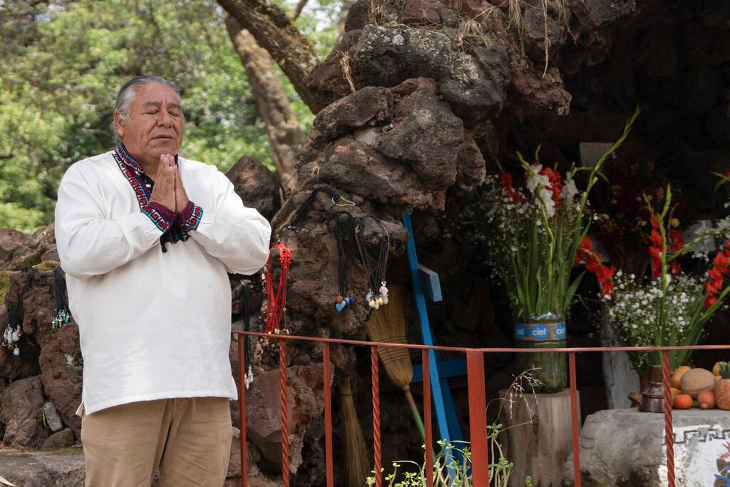 Frente a una cueva artificial que recrea los adoratorios que los vecinos del Popocatépetl han construido sobre él, don Moi cuenta que los rituales que realiza fusionan elementos prehispánicos y cristianos.