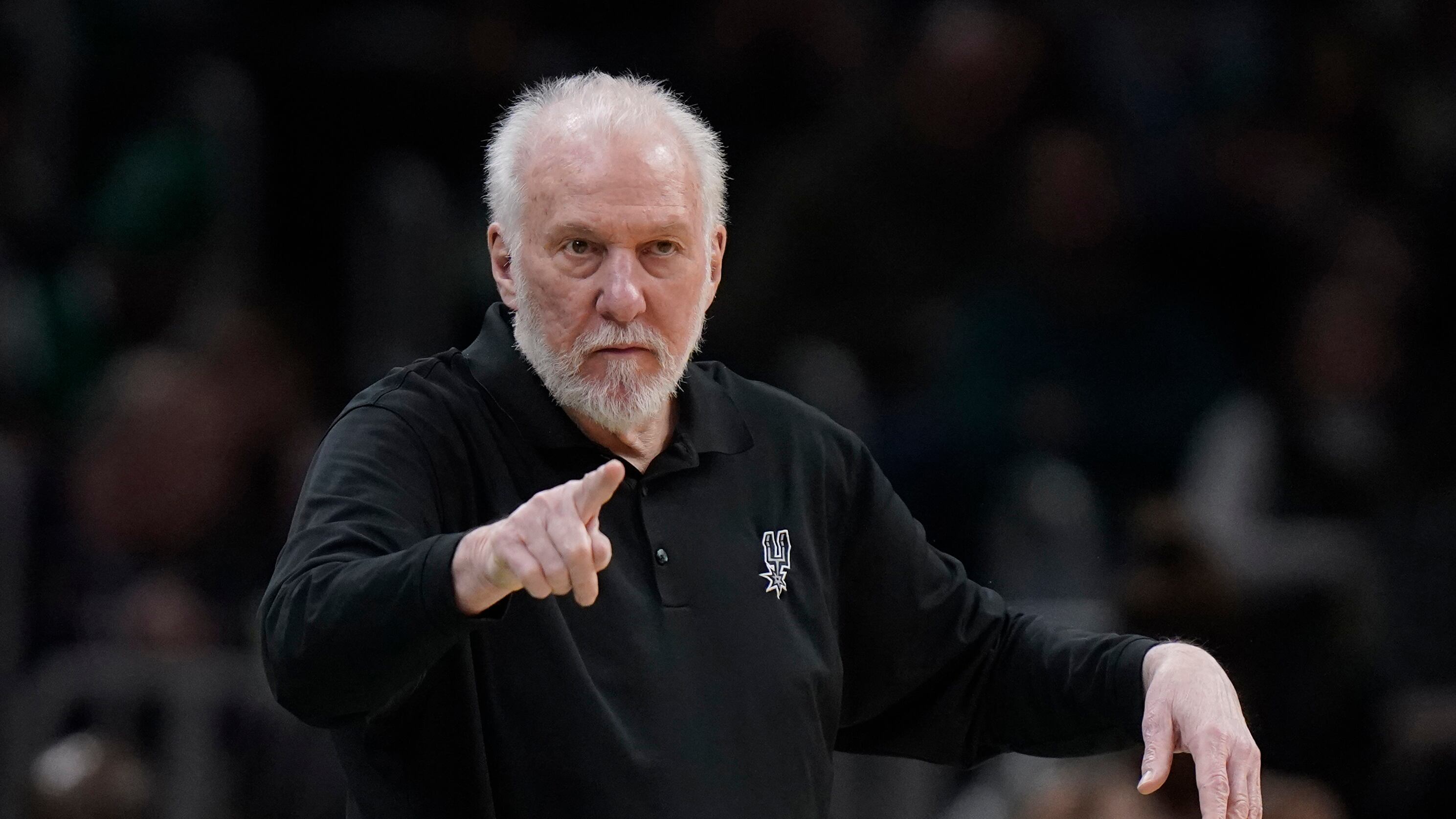 ARCHIVO - Foto del 26 de marzo del 2023, el entrenador de los Spurs de San Antonio Gregg Popovich señala desde la banca en el juego ante los Celtics de Boston. El sábado 8 de julio del 2023, los Spurs anuncian que Popovich firmó por otros cinco años. AP (Steven Senne/AP)
