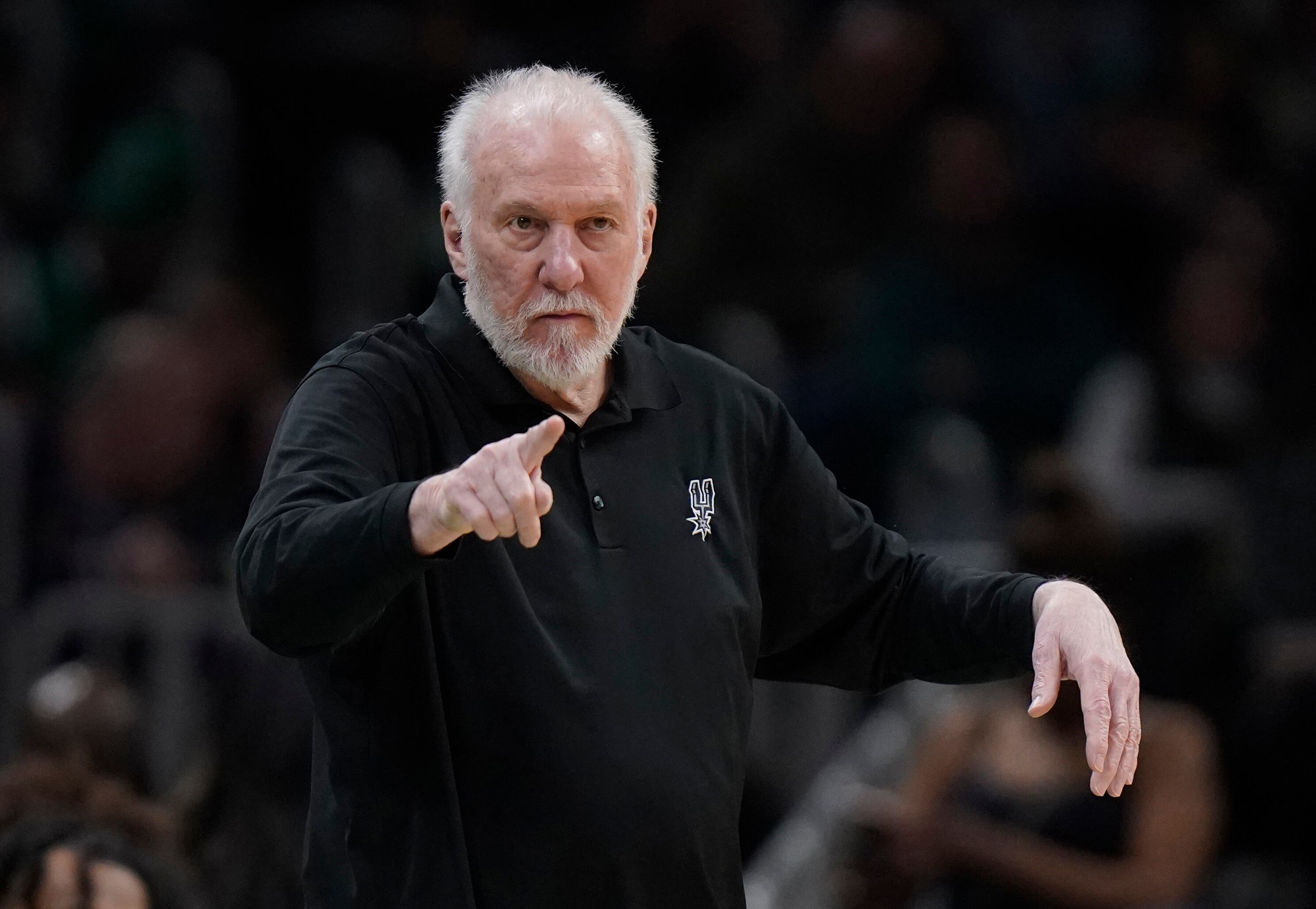 ARCHIVO - Foto del 26 de marzo del 2023, el entrenador de los Spurs de San Antonio Gregg Popovich señala desde la banca en el juego ante los Celtics de Boston. El sábado 8 de julio del 2023, los Spurs anuncian que Popovich firmó por otros cinco años. AP (Steven Senne/AP)