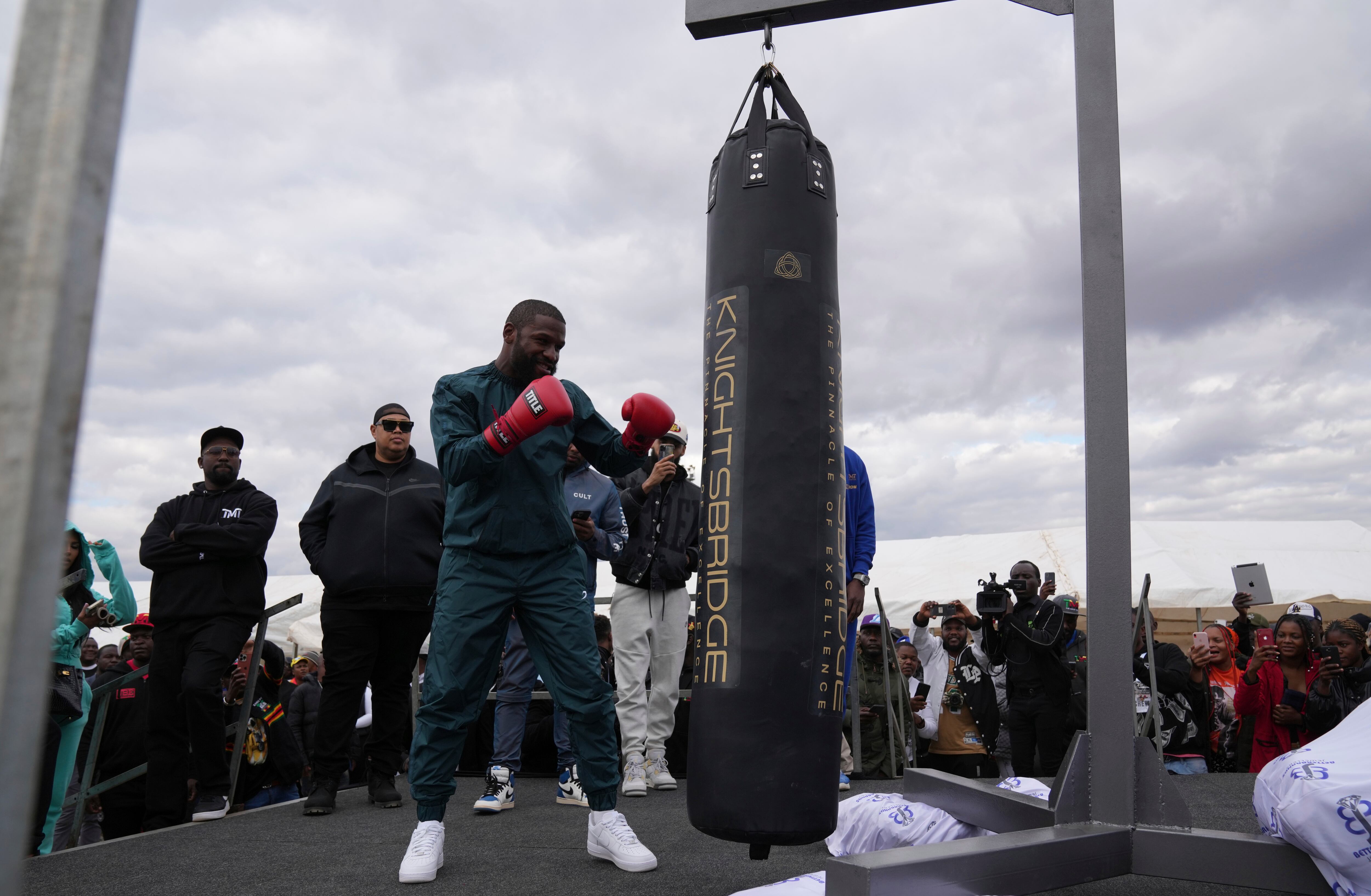Cientos de personas corearon “Mayweather mbinga... mbinga” (Mayweather... el tipo rico) cuando el expúgil de 46 años, quien ha ganado títulos en cinco divisiones con una foja de 50-0 en su carrera, propinó golpes a un saco y realizó otras actividades de exhibición.