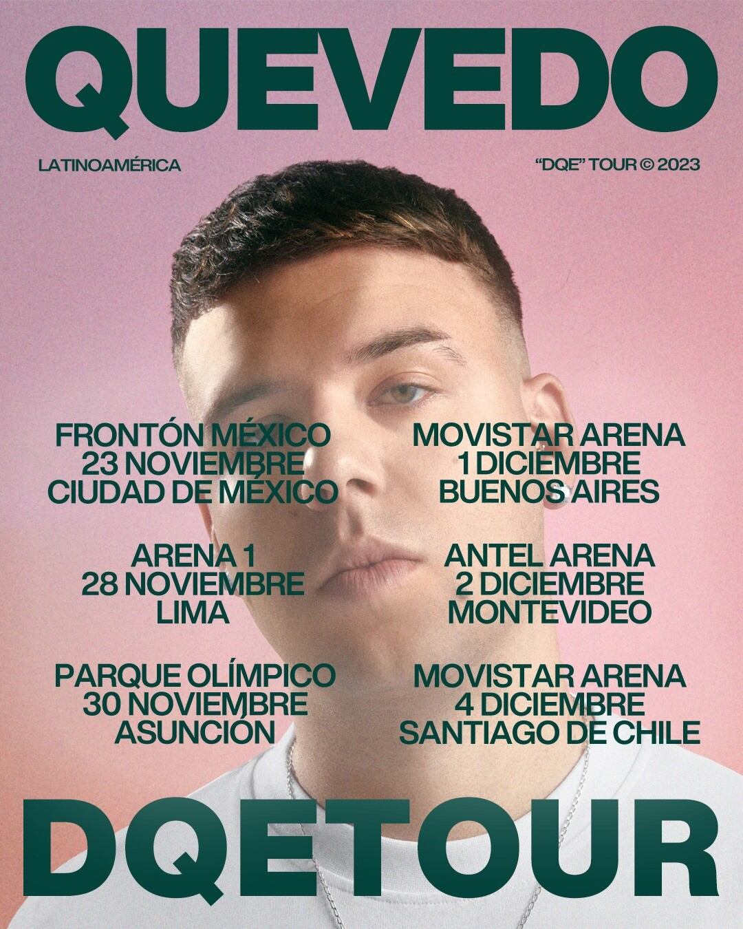 El artista español es uno de los cantantes más escuchados en todo el mundo, según datos de Spotify. Quevedo iniciará su gira el próximo 23 de noviembre en México, (Ciudad de México, Frontón Mexico), y continuará el 28 de noviembre en Perú (Lima, Arena 1), el día 30 en Paraguay (Asunción, Parque Olímpico), 1 de diciembre en Argentina (Buenos Aires, Movistar Arena), el 2 de diciembre en Uruguay (Montevideo, Antel Arena) y cerrará el dia 4 Chile (Santiago de Chile, Movistar Arena).