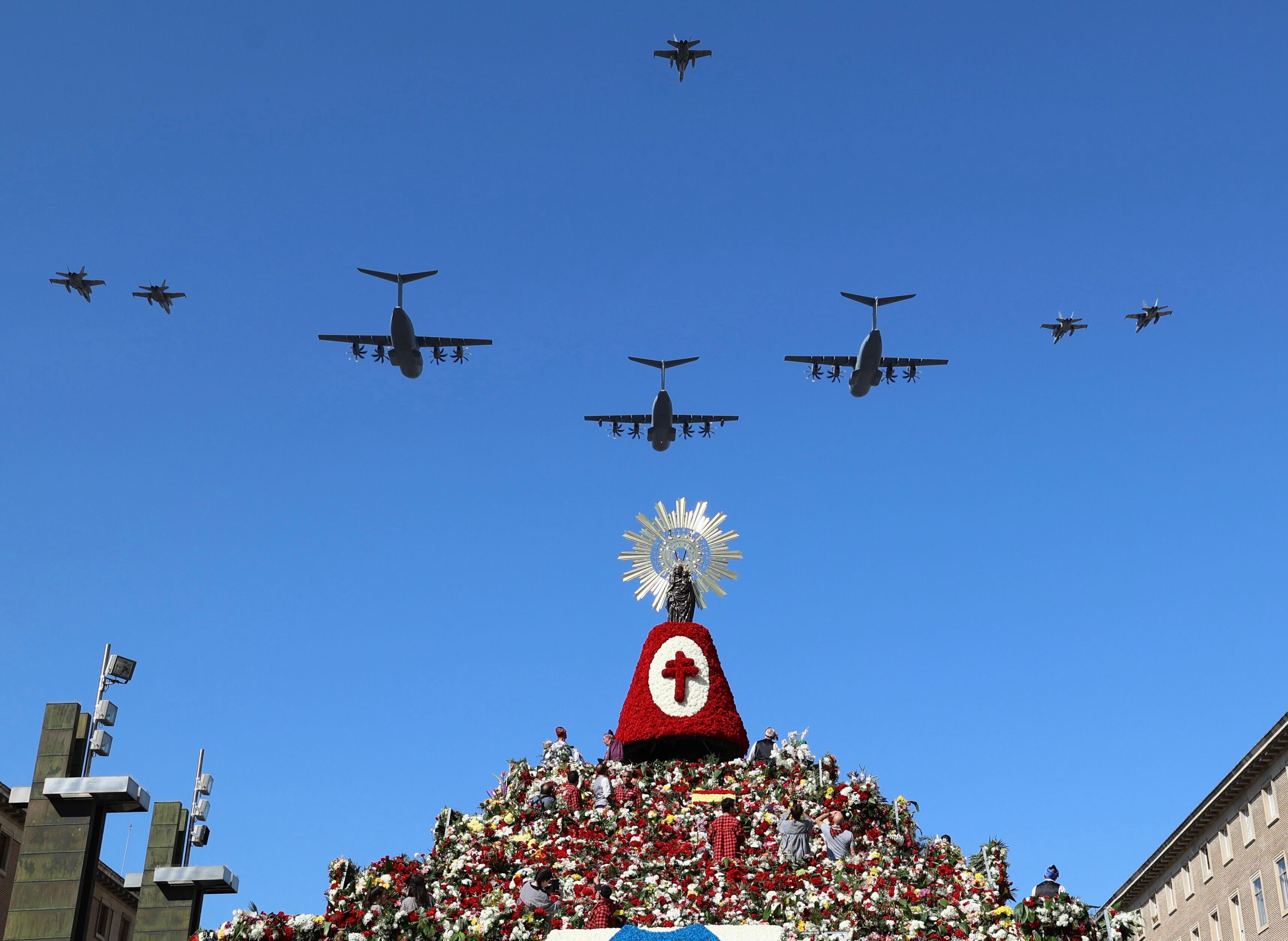 Archivo - Aviones del Ala 15 y 31 vuelan por encima de la Virgen del Pilar durante la tradicional ofrenda de flores en el día de su festividad, a 12 de octubre de 2022, en Zaragoza, Aragón (España). Este año la ofrenda celebra su 63ª edición y se su Fabián Simón - Europa Press - Archivo (Fabián Simón - Europa Press/Europa Press)