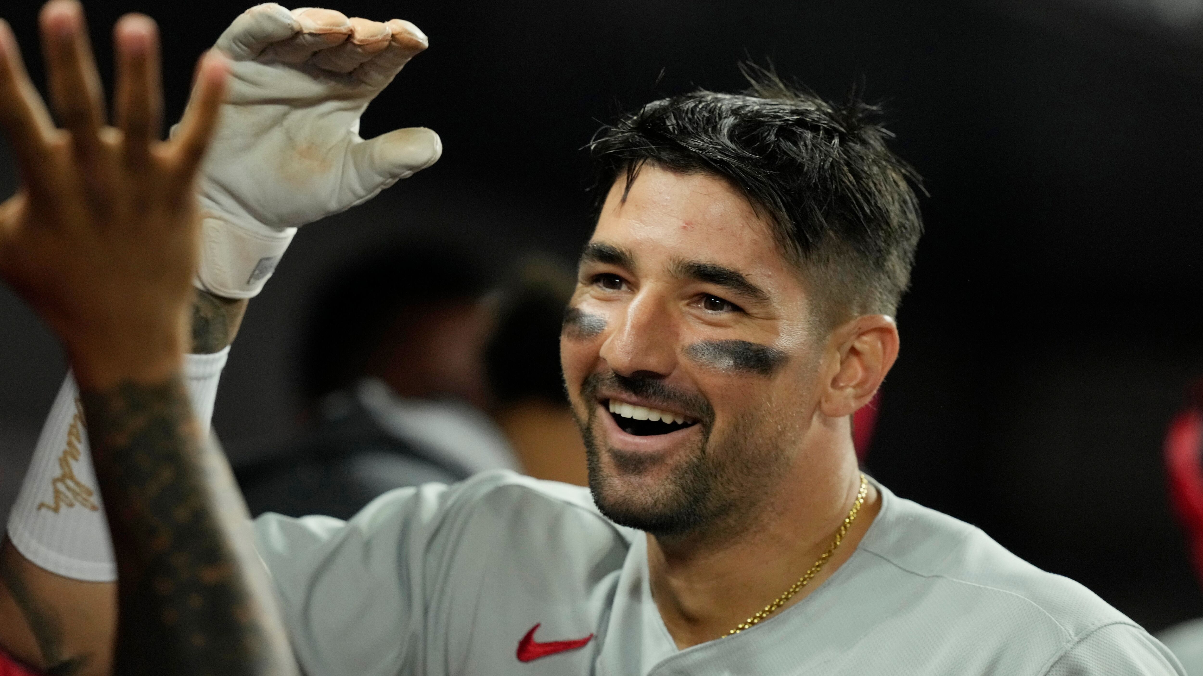 Nick Castellanos, de los Filis de Filadelfia, es felicitado tras conseguir un jonrón de dos carreras en el encuentro del martes 1 de agosto de 2023, ante los Marlins de Miami (AP Foto/Marta Lavandier) AP (Marta Lavandier/AP)