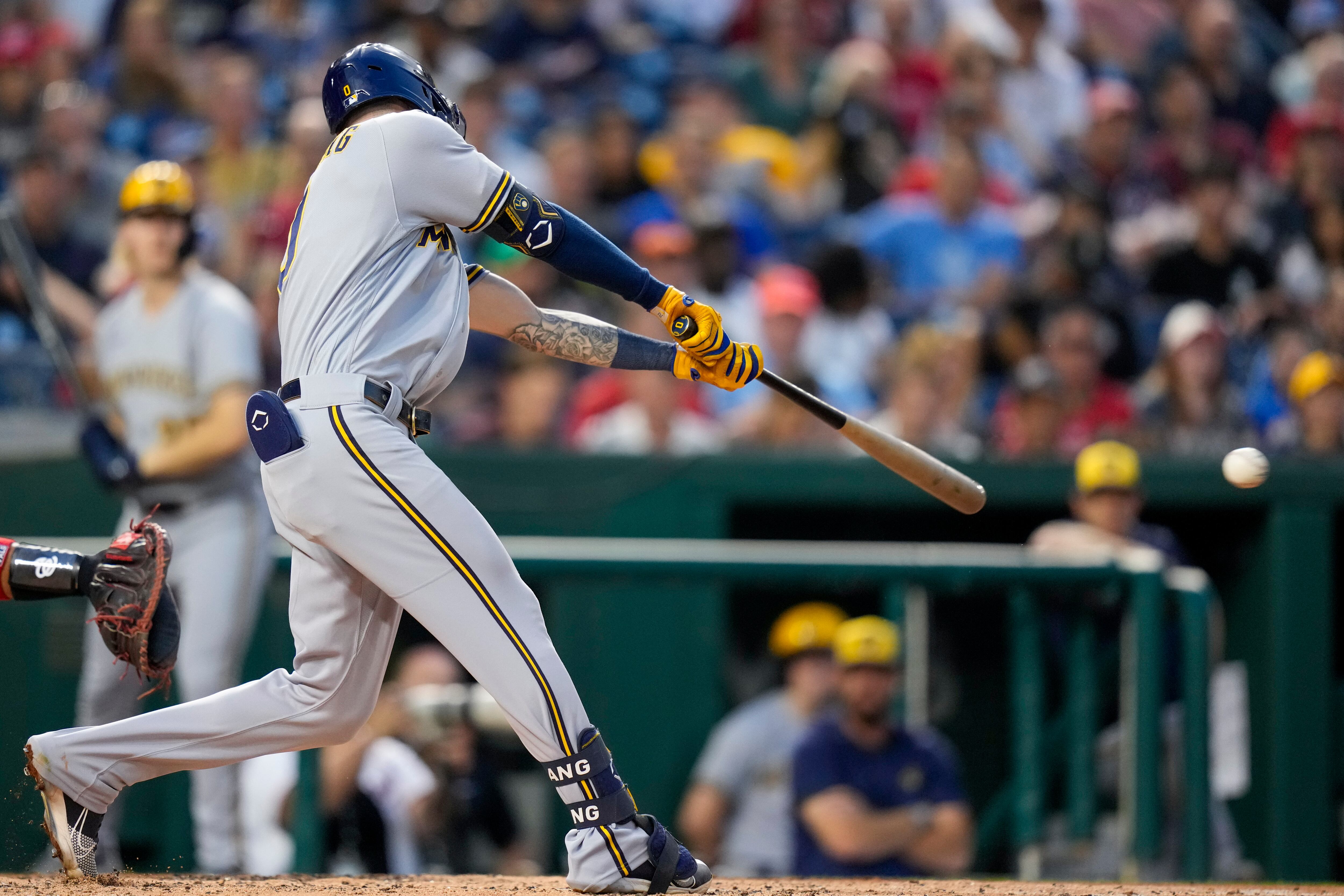 Brice Turang, de los Cerveceros de Milwaukee, batea un sencillo de dos carreras en el duelo del martes 1 de agosto de 2023, ante los Nacionales de Washington (AP Foto/Alex Brandon) AP (Alex Brandon/AP)