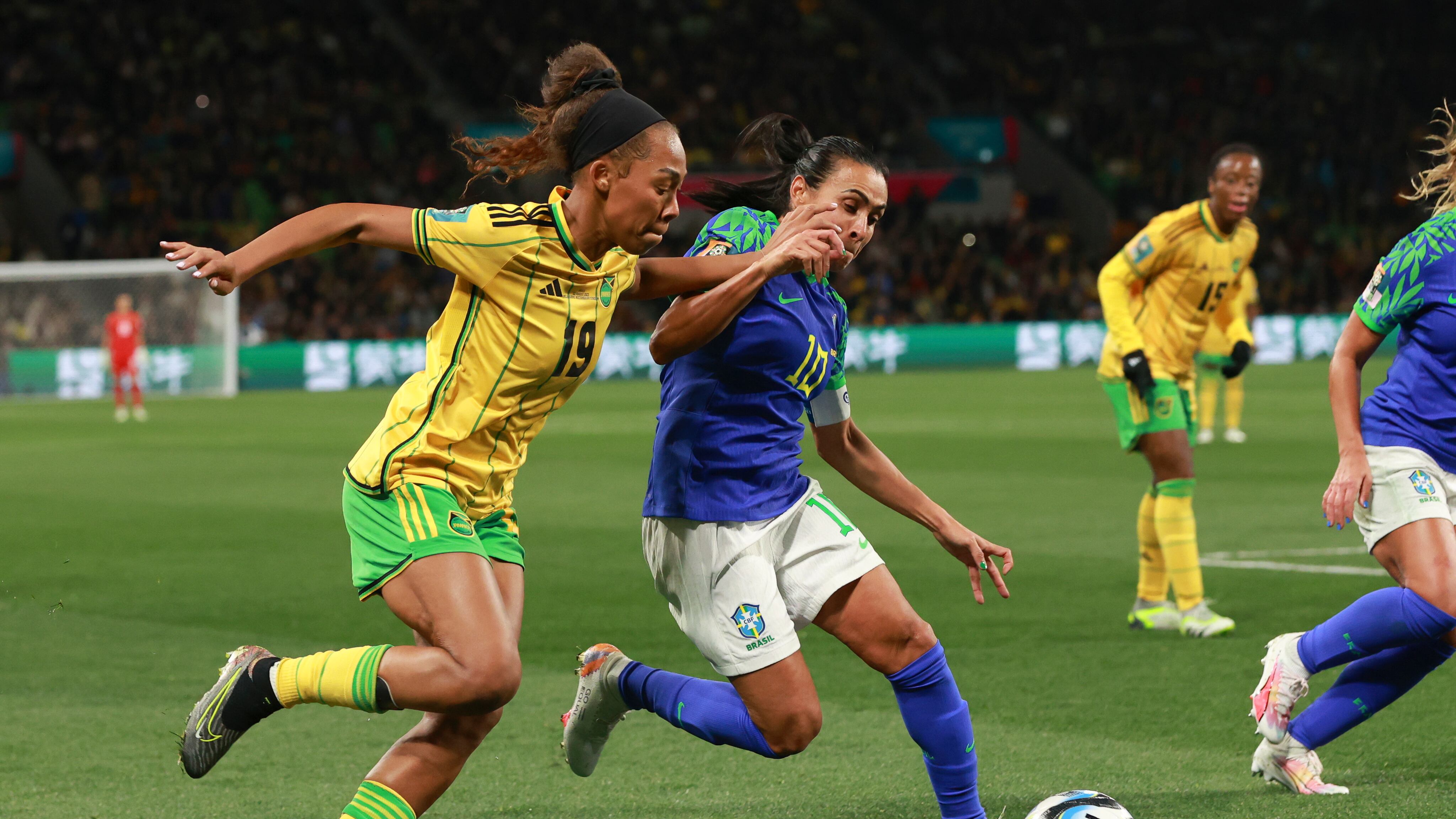 Las “Reggae Girlz” acababan de eliminar a Brasil y Marta, mandándolas a casa con un empate 0-0 el miércoles por la noche, y Shaw compartió palabras emotivas con una mano en su corazón y la otra tomando la mano de Marta.