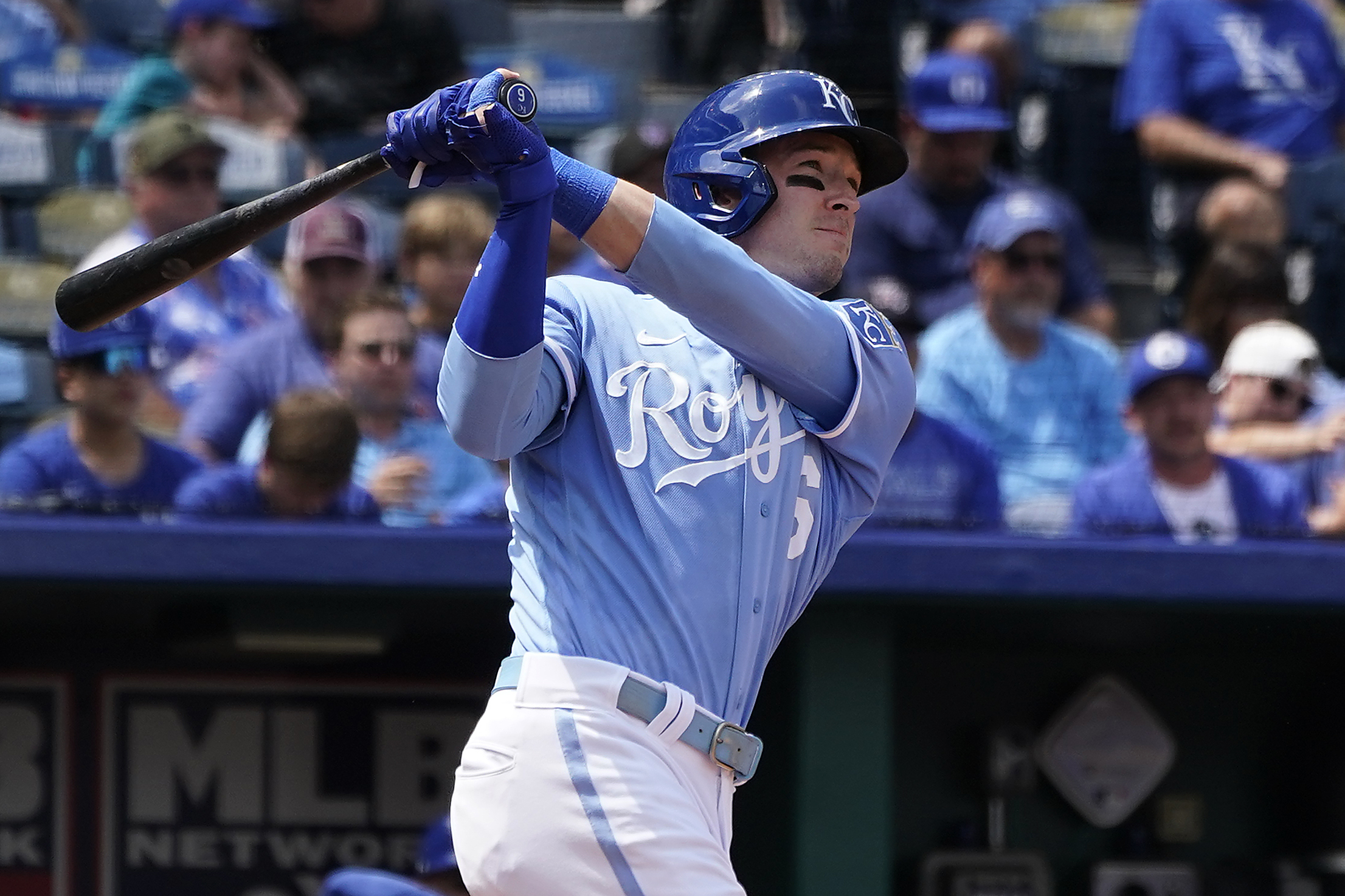 Por los Reales, los venezolanos Maikel García de 3-2, una impulsada; Salvador Pérez de 4-1, una impulsada; y Freddy Fermín de 4-2, dos anotadas.
