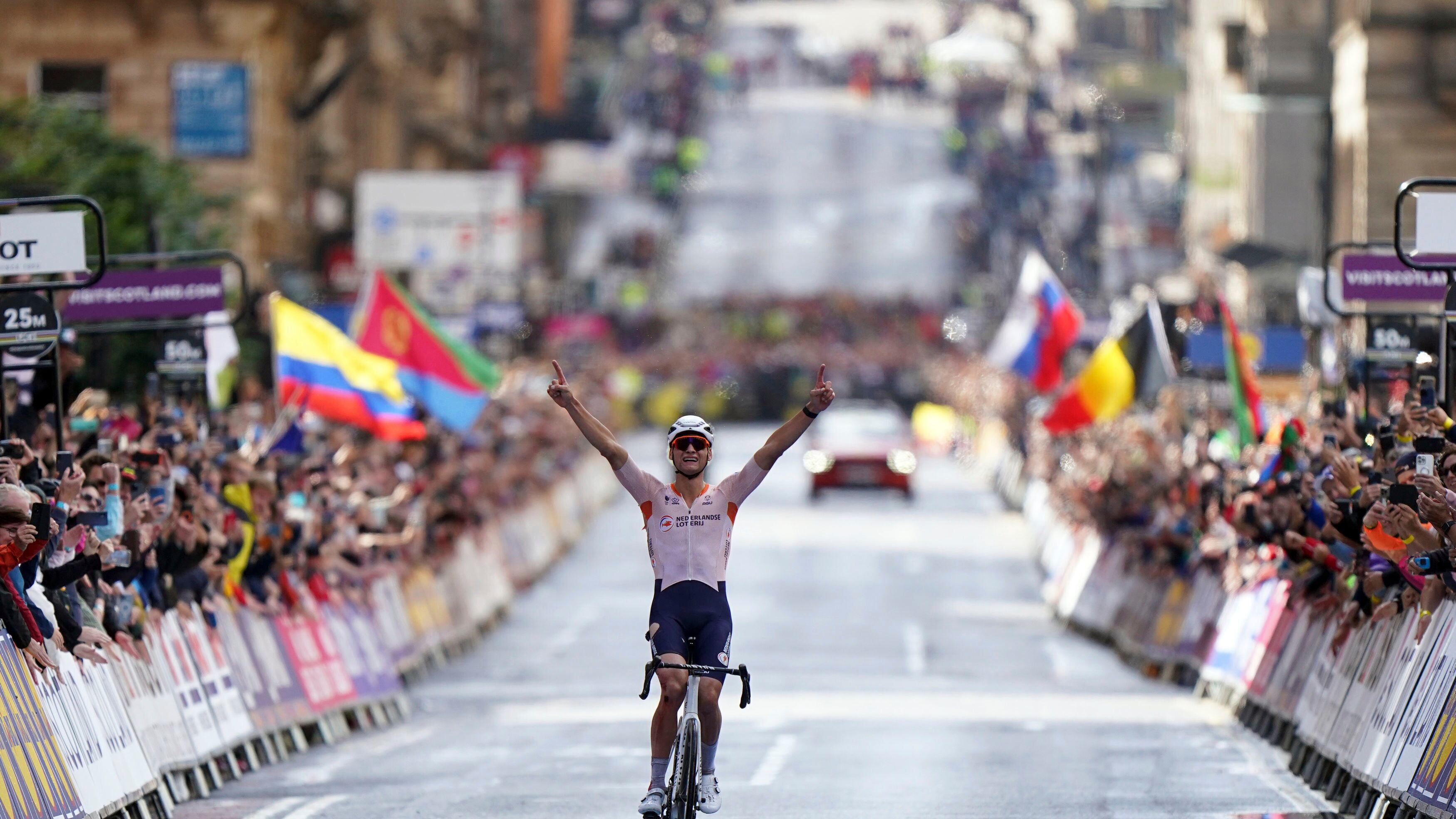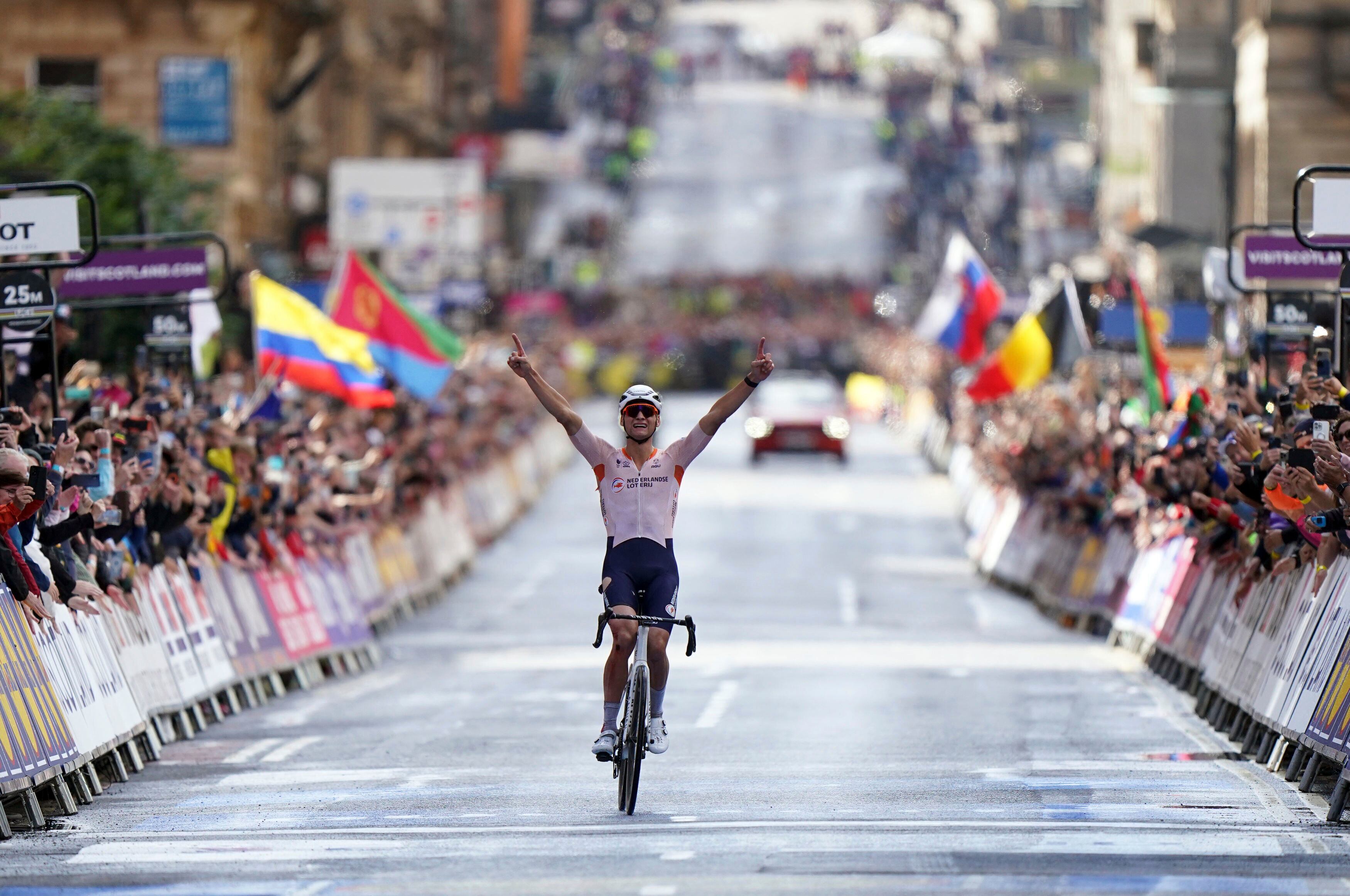 Van der Poel pedaleaba junto Tadej Pogačar, el dos veces campeón del Tour de Francia; Wout van Aert, especialista de clásicas de un día; y Mads Pedersen, un excampeón mundial. Lograron cazar al fugado Alberto Bettiol y finalmente van der Poel se escapó, en medio de la lluvia, para llevarse la victoria en las empapadas calles del centro de Glasgow, Escocia.