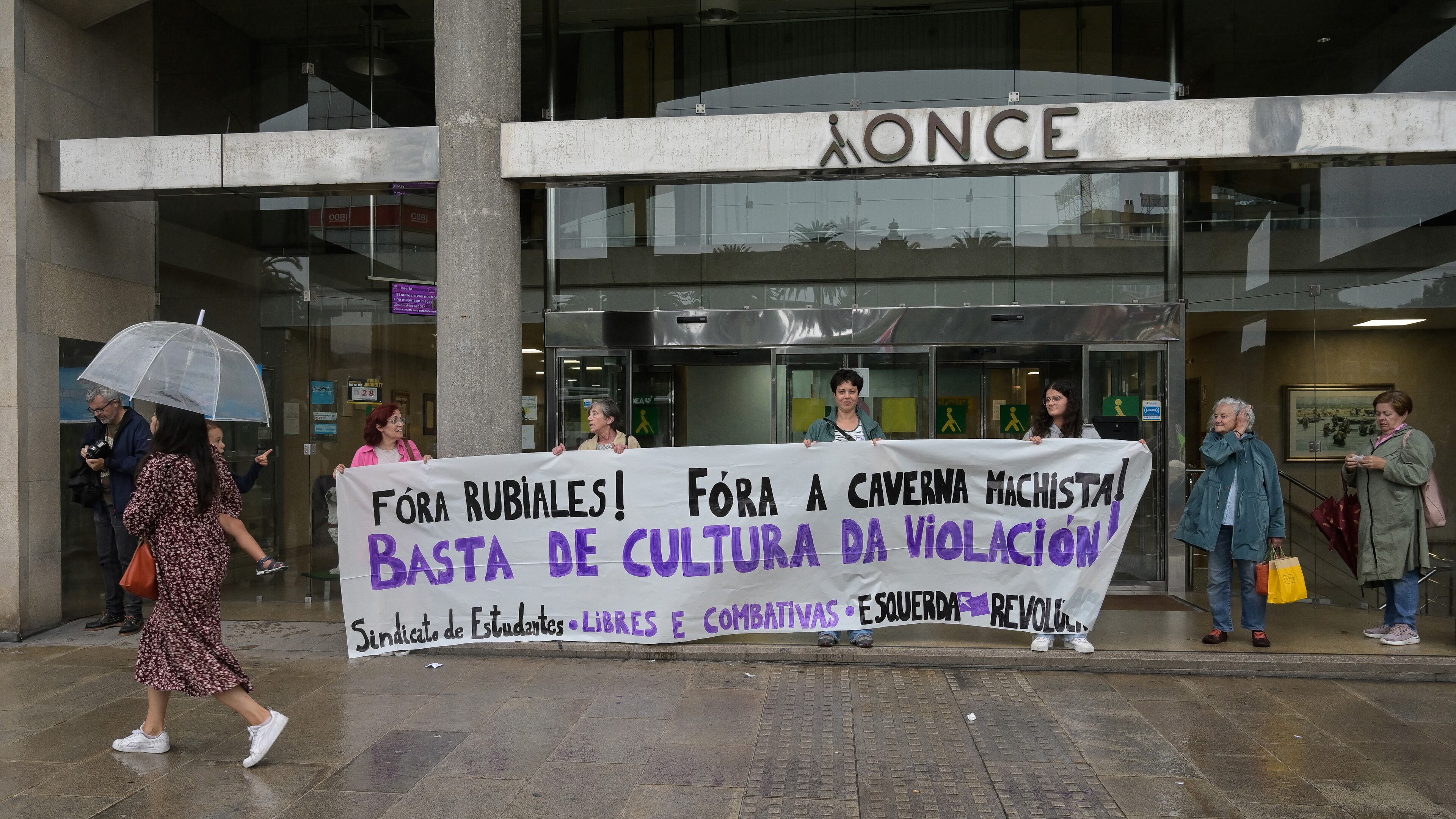 Lo han hecho pese a la lluvia y con una pancarta con el lema 'Fuera Rubiales, fuera caverna machista y basta ya de cultura de la violación', en una movilización convocada por el colectivo feminista Libres y Combativas.