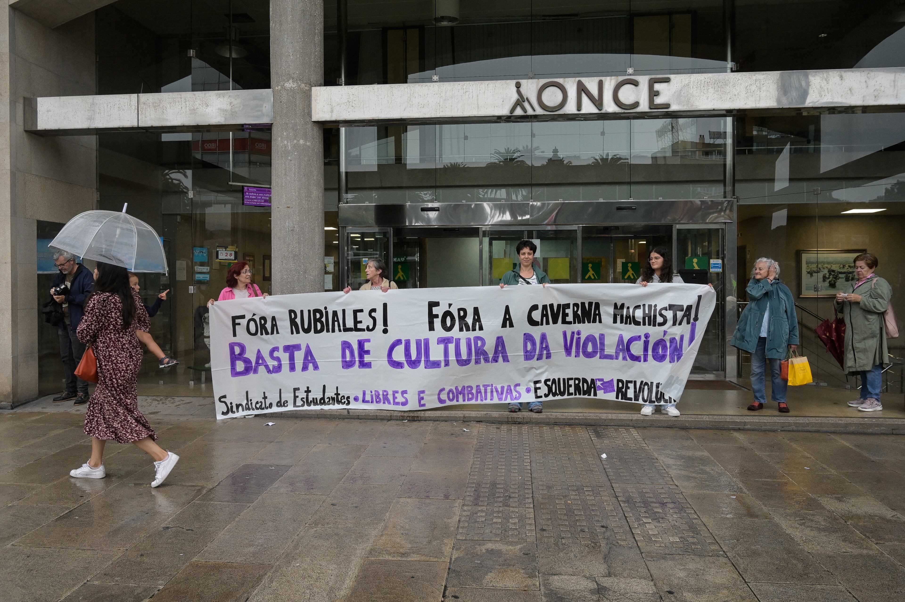 Lo han hecho pese a la lluvia y con una pancarta con el lema 'Fuera Rubiales, fuera caverna machista y basta ya de cultura de la violación', en una movilización convocada por el colectivo feminista Libres y Combativas.