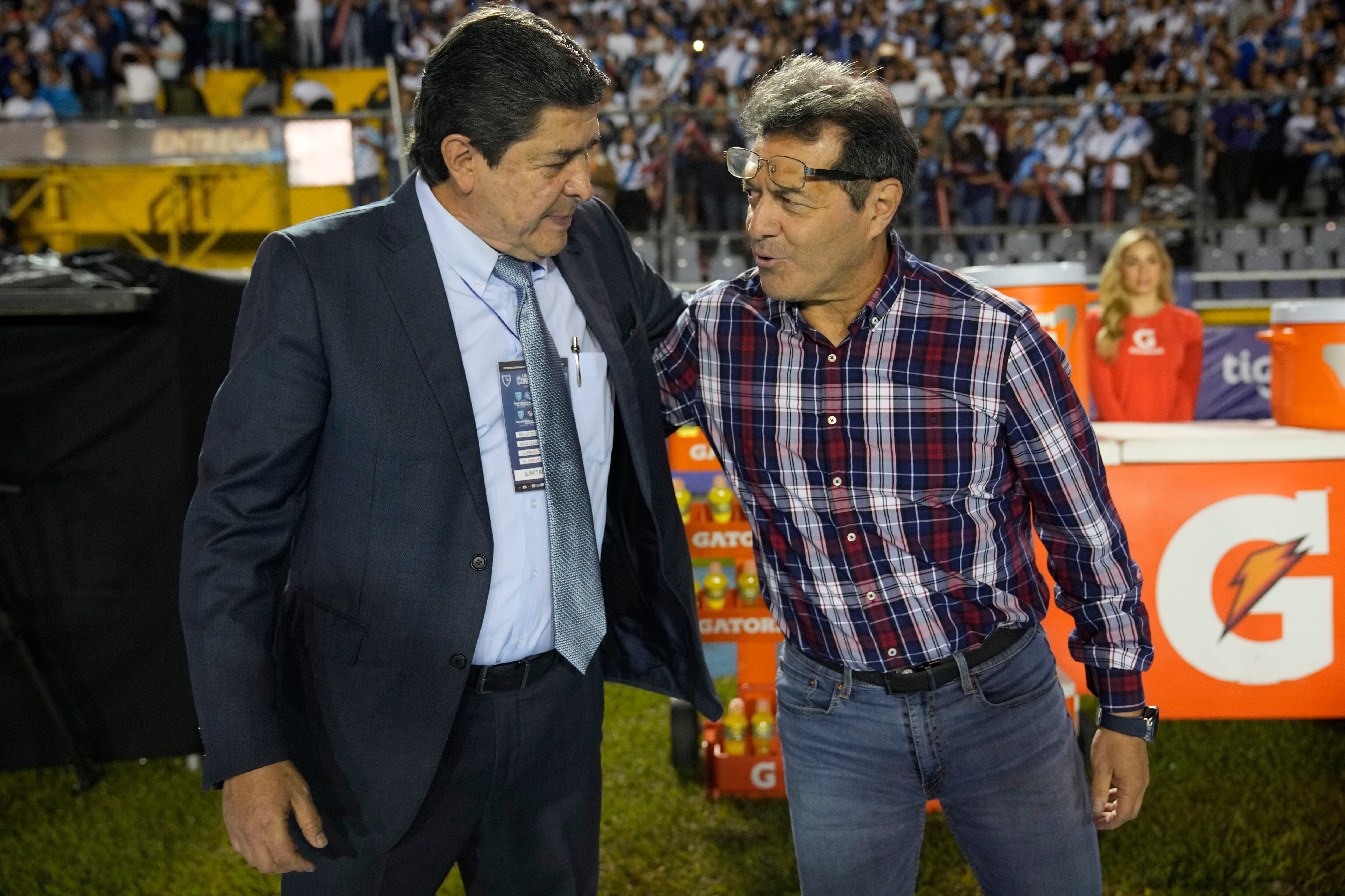 El técnico mexicano de Guatemala, Luis Fernando Tena, abraza a su colega de El Salvador Hugo Pérez, antes de un partido de la Liga de Naciones de la CONCACAF, el jueves 7 de septiembre de 2023 (AP Foto/Moisés Castillo) AP (Moises Castillo/AP)