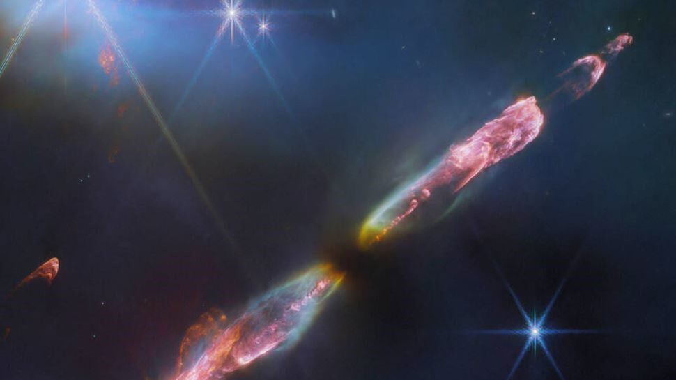 La imagen muestra una serie de arcos de choque hacia el sureste (abajo a la izquierda) y al noroeste (arriba a la derecha), así como el estrecho chorro bipolar que los impulsa. Webb revela esta escena con un detalle sin precedentes: aproximadamente de 5 a 10 veces mayor resolución espacial que cualquier imagen anterior de HH 211. Se ve que el chorro interior se "menea" con simetría especular a ambos lados de la protoestrella central. Esto concuerda con observaciones a escalas más pequeñas y sugiere que la protoestrella puede ser, de hecho, una estrella binaria no resuelta.