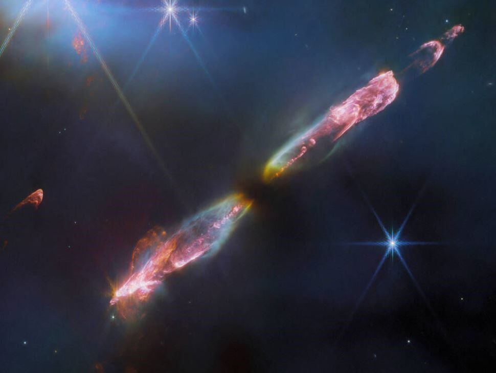 La imagen muestra una serie de arcos de choque hacia el sureste (abajo a la izquierda) y al noroeste (arriba a la derecha), así como el estrecho chorro bipolar que los impulsa. Webb revela esta escena con un detalle sin precedentes: aproximadamente de 5 a 10 veces mayor resolución espacial que cualquier imagen anterior de HH 211. Se ve que el chorro interior se "menea" con simetría especular a ambos lados de la protoestrella central. Esto concuerda con observaciones a escalas más pequeñas y sugiere que la protoestrella puede ser, de hecho, una estrella binaria no resuelta.