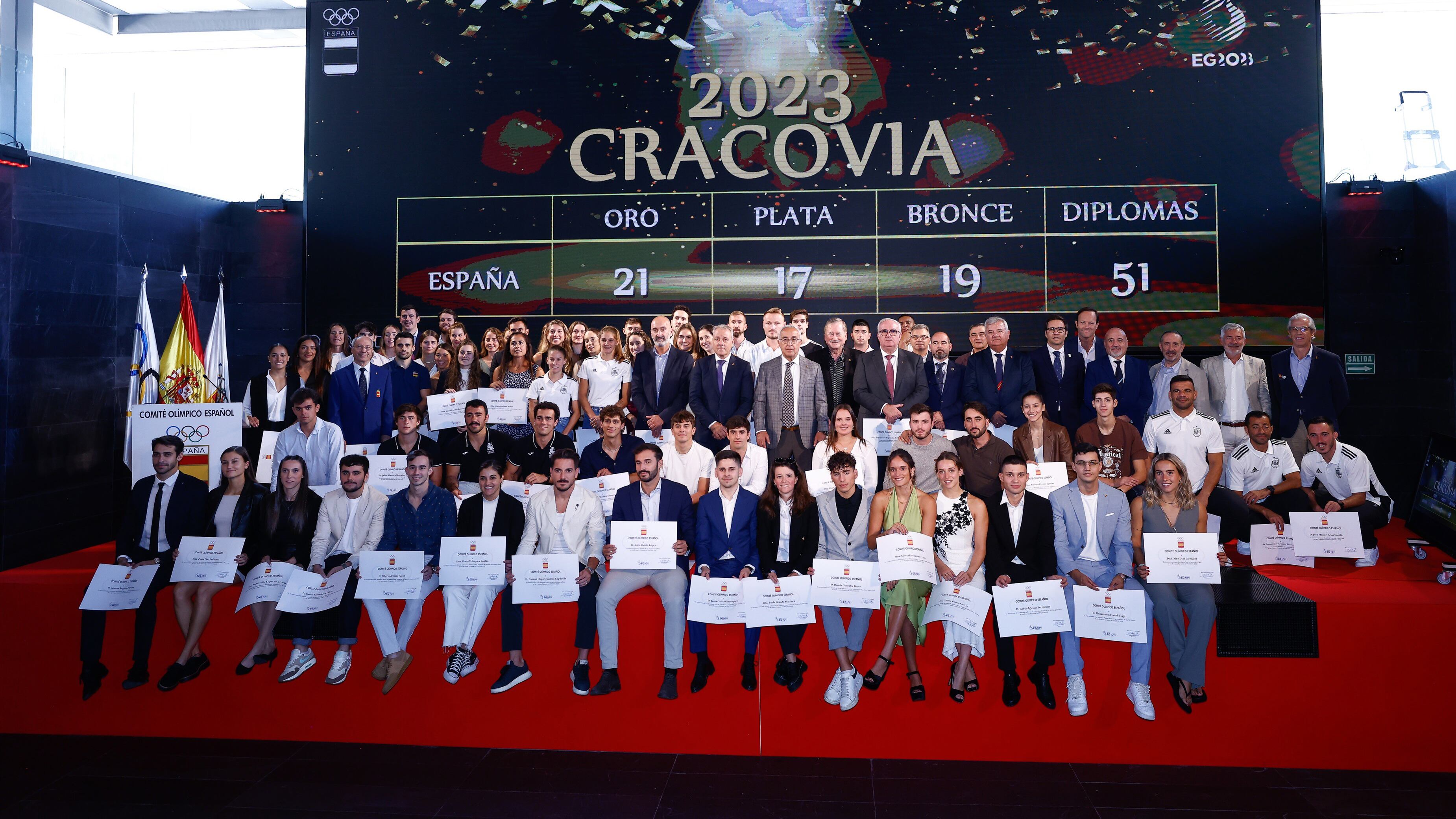 El Auditorio Alfredo Goyeneche del Comité Olímpico Español acogió el homenaje a los deportistas españoles que en los Juegos Europeos de Cracovia 2023 se subieron al podio y llevaron el nombre de España hasta el segundo puesto del medallero, consiguiendo 57 medallas, 21 de oro, 17 de plata y 19 de bronce, además de otros 51 diplomas.