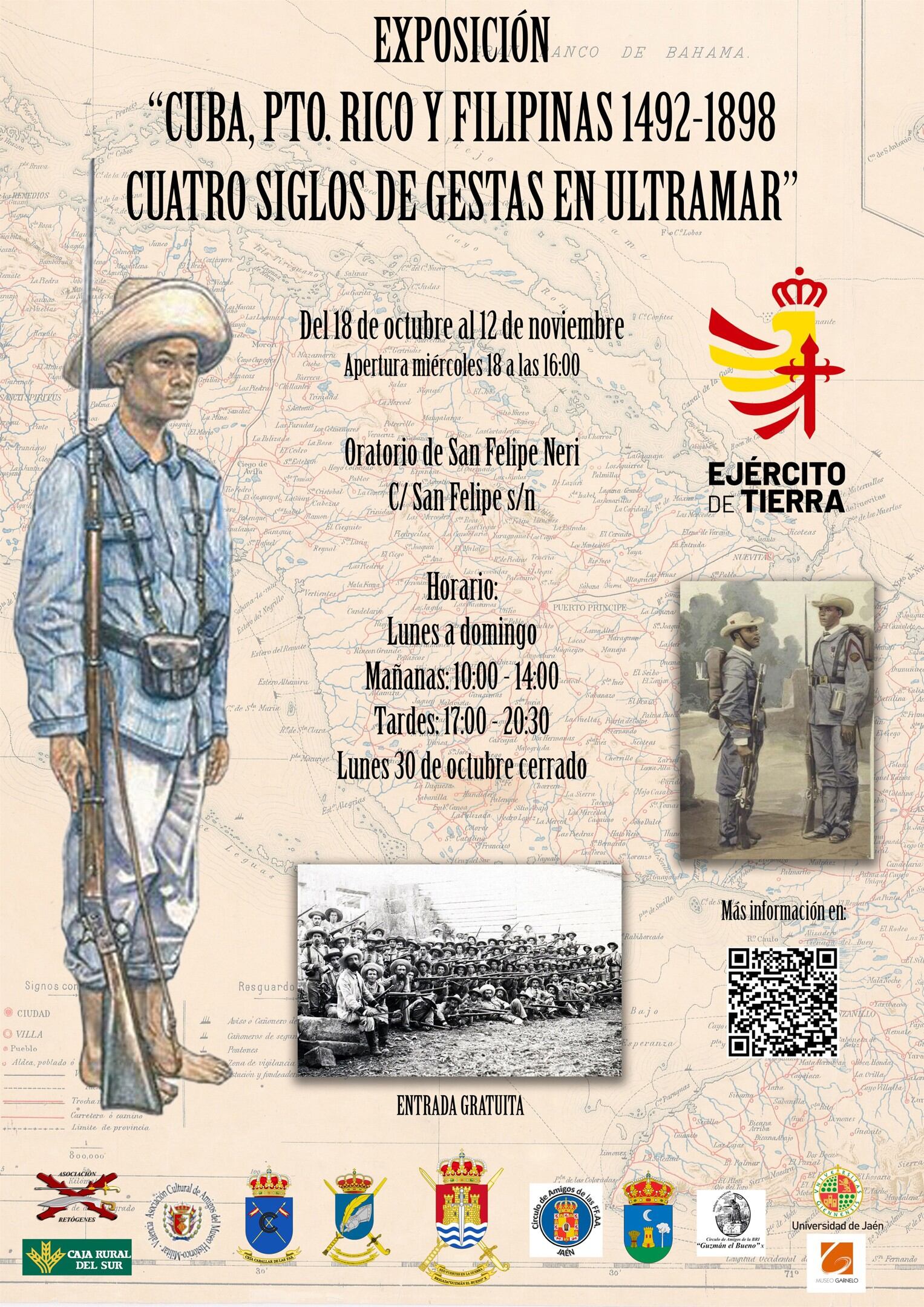 Así, se ha organizado una exposición en el Oratorio de San Felipe que tratará los aspectos de antecedentes y contexto histórico, mostrando cómo era aquel ejército en las campañas de ultramar, sus mandos, sus equipos y pertrechos o elementos de la vida cotidiana, así como los hechos de armas más representativos en Cuba, Puerto Rico (Antillas) y las Islas Filipinas.