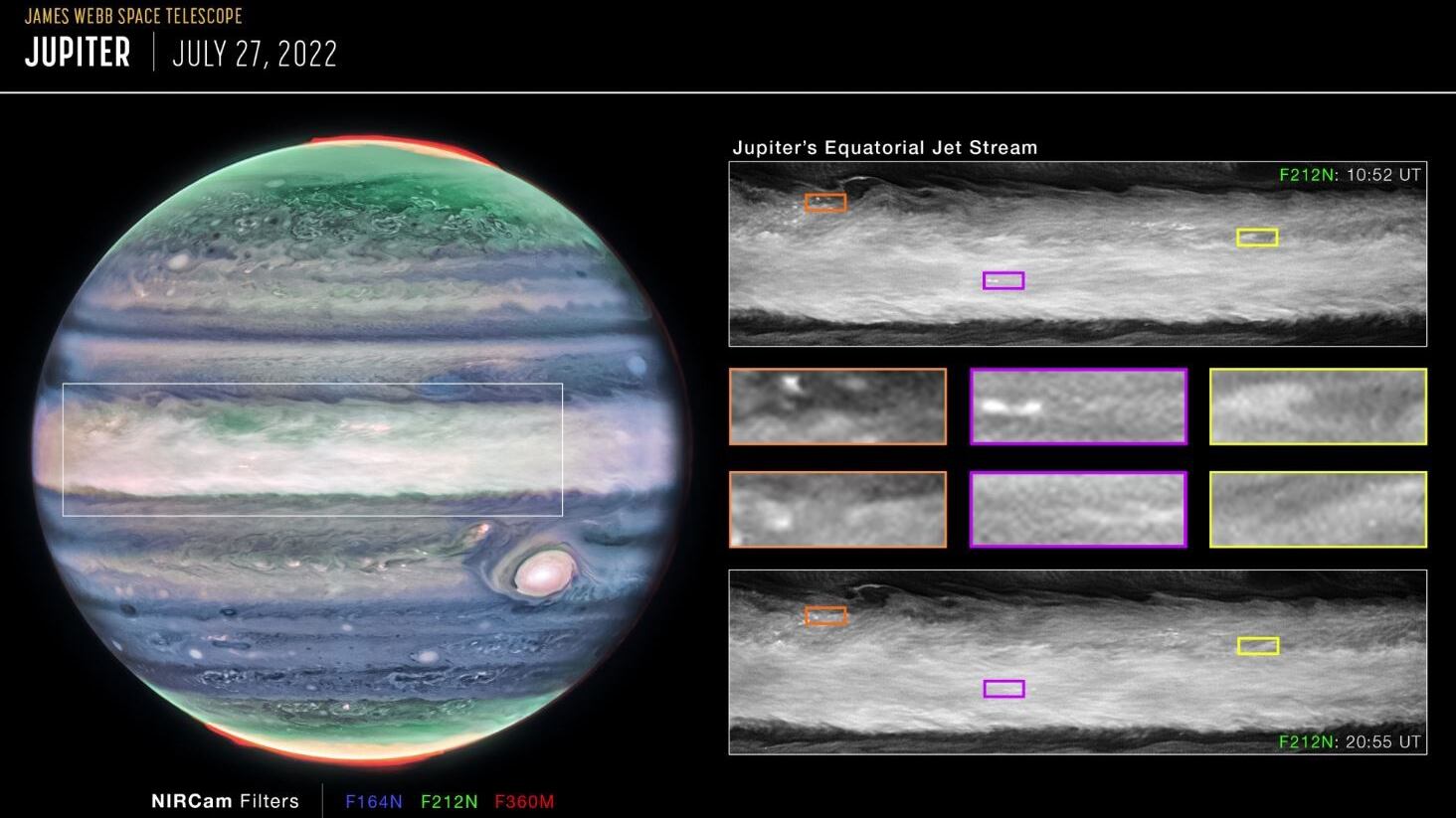 Por otro lado, la mirada de Webb más hacia el infrarrojo cercano que antes es sensible a las capas de mayor altitud de la atmósfera, alrededor de 25 a 50 kilómetros por encima de las cimas de las nubes de Júpiter. En las imágenes del infrarrojo cercano, las neblinas a gran altitud suelen aparecer borrosas, con un brillo mayor en la región ecuatorial. Con Webb, los detalles más finos se resuelven dentro de la banda brillante y nebulosa.