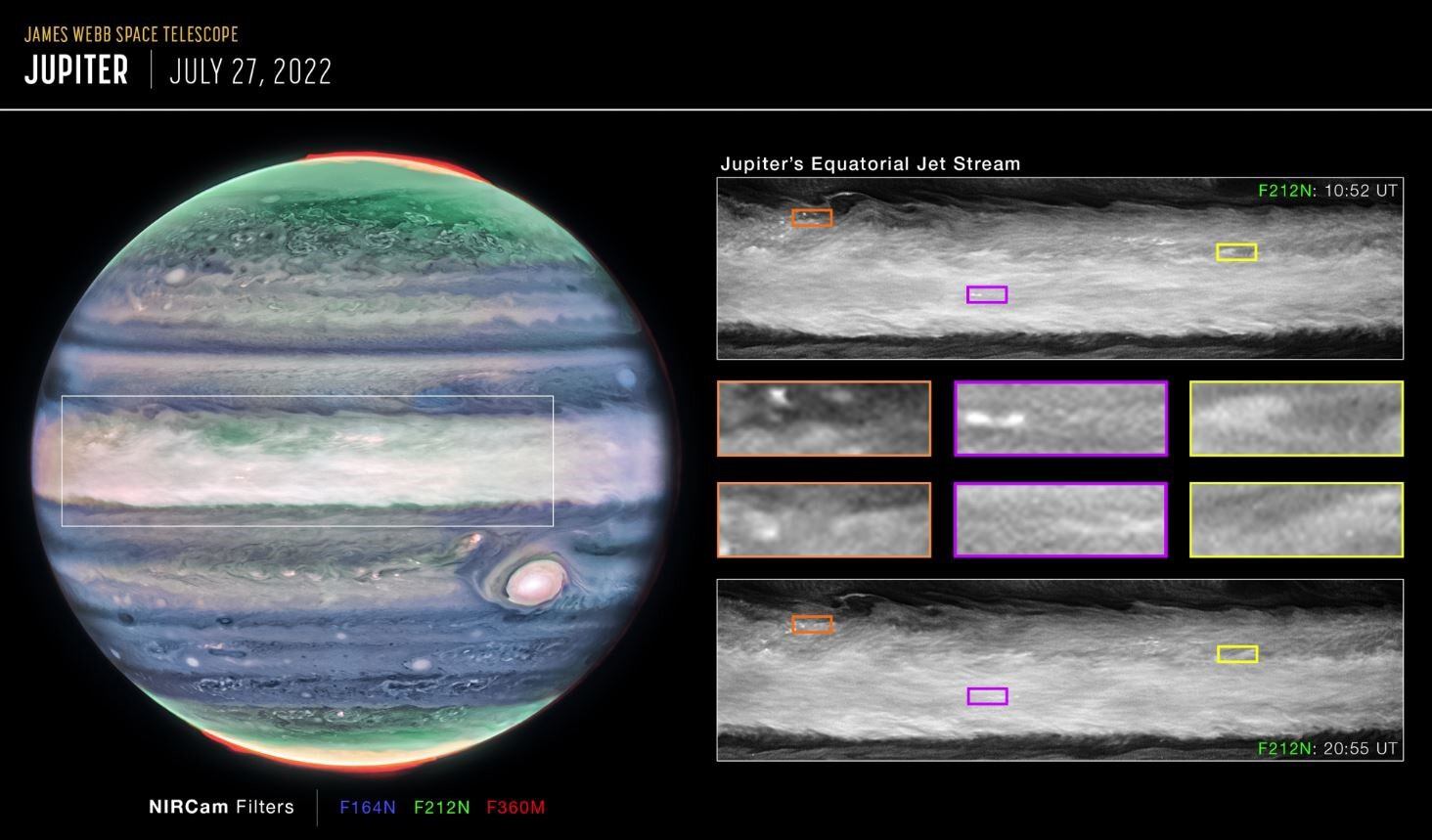 Por otro lado, la mirada de Webb más hacia el infrarrojo cercano que antes es sensible a las capas de mayor altitud de la atmósfera, alrededor de 25 a 50 kilómetros por encima de las cimas de las nubes de Júpiter. En las imágenes del infrarrojo cercano, las neblinas a gran altitud suelen aparecer borrosas, con un brillo mayor en la región ecuatorial. Con Webb, los detalles más finos se resuelven dentro de la banda brillante y nebulosa.