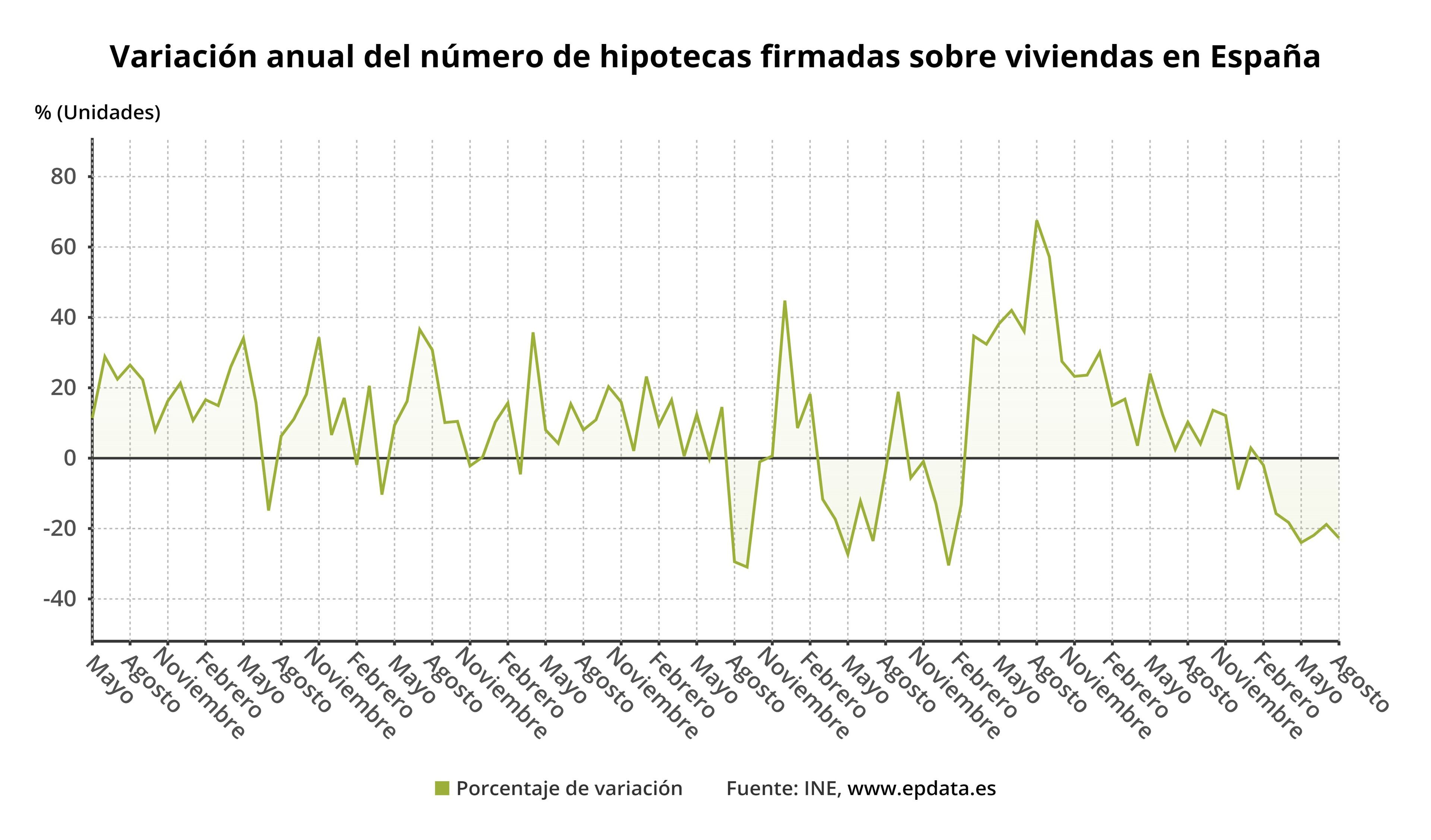 Con el descenso interanual de agosto, la firma de hipotecas sobre viviendas encadena siete meses de tasas negativas, aunque la de agosto ha sido más pronunciada que la registrada en julio (-18,8%).