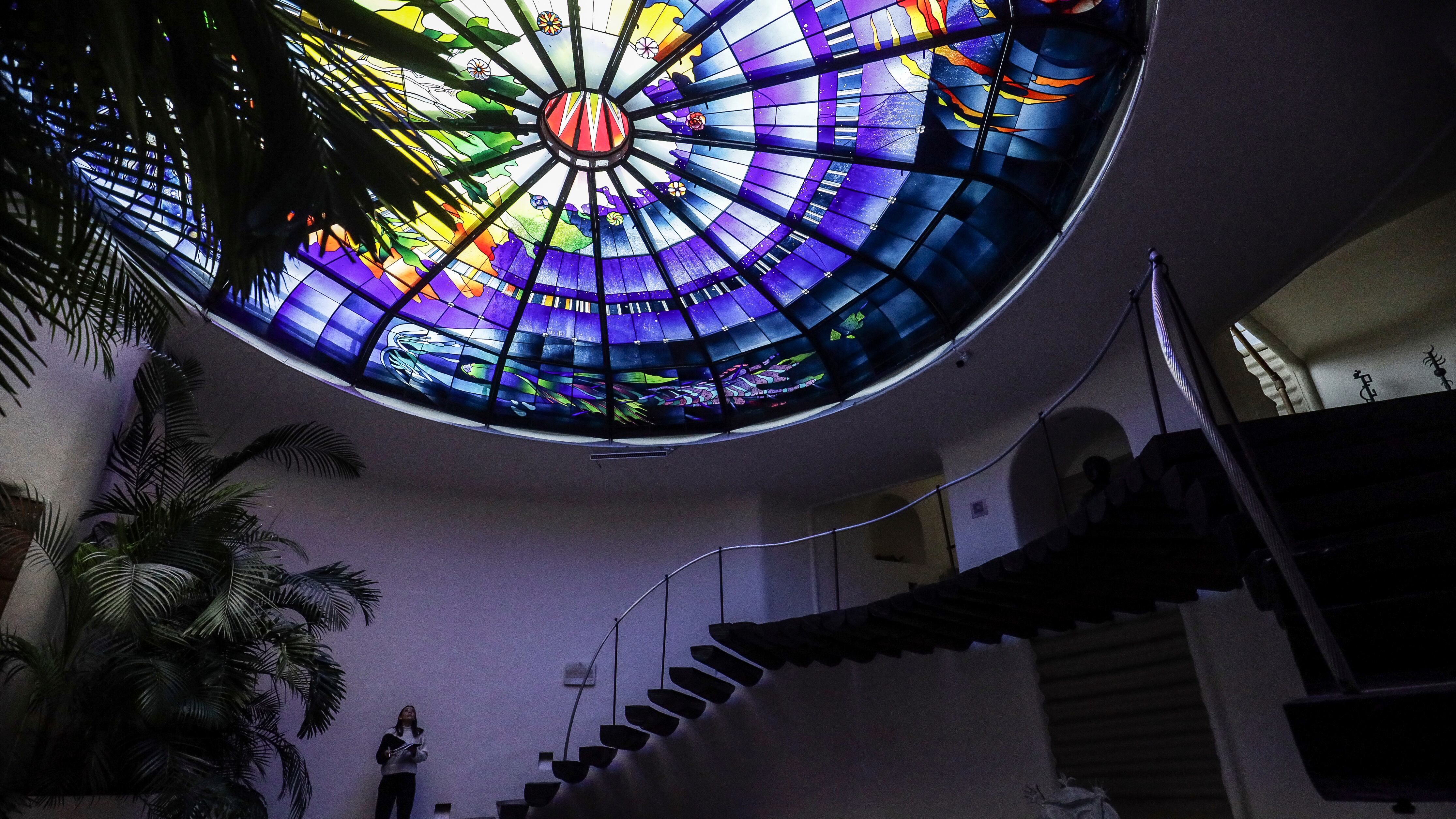 El vitral de la bóveda llamado La Segunda Inocencia, el Sueño de Dionisos, del artista italiano Narcissus Quagliata decora el hotel El Santuario Resort hotel en Valle de Bravo, México, el miércoles 25 de octubre de 2023. En las últimas cinco décadas AP (Ginnette Riquelme/AP)