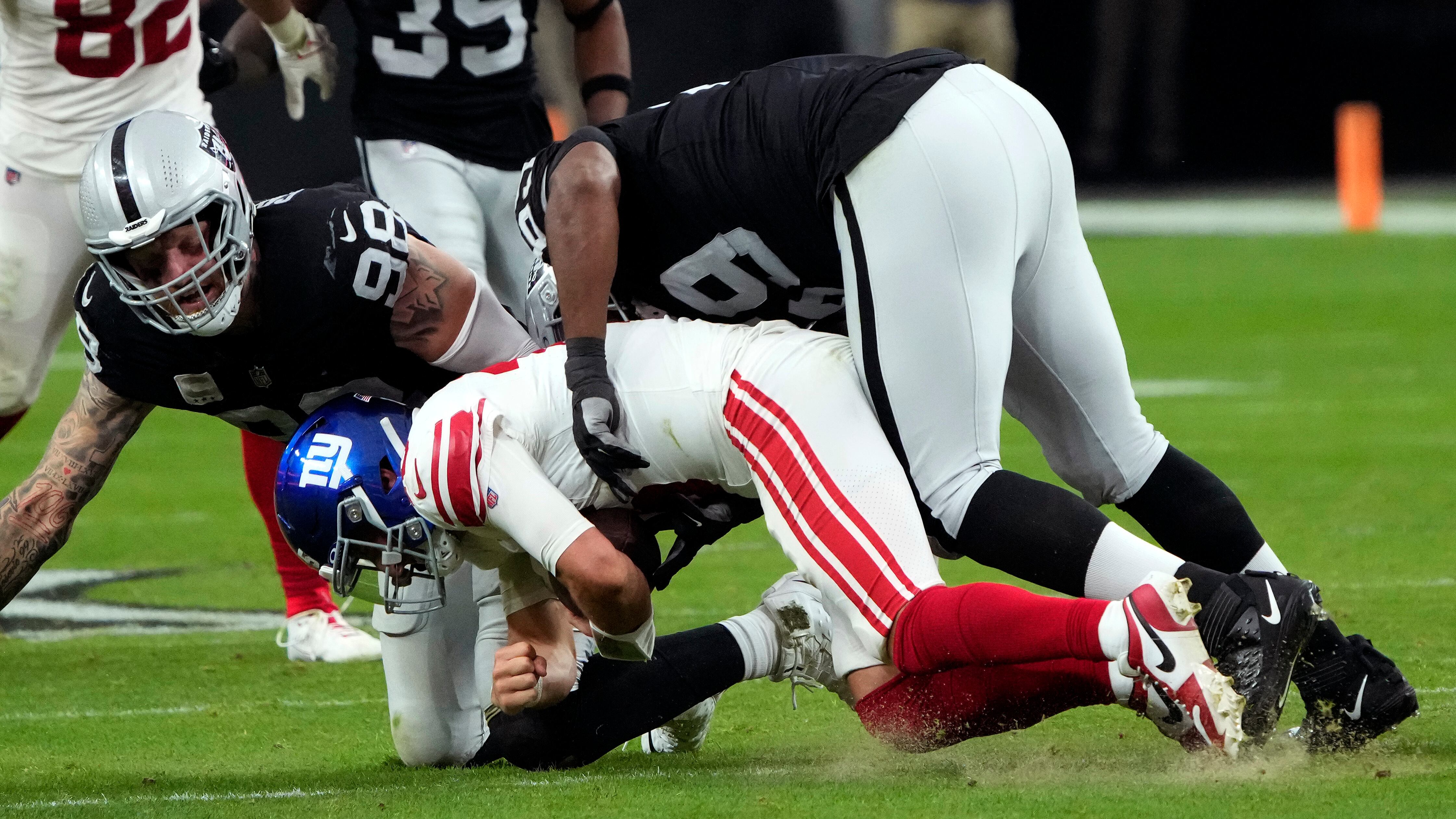 El quarterback de los Giants de Nueva York Daniel Jones capturado por el defensive end de los Raiders de Las Vegas Maxx Crosby y el tacle Adam Butler en el encuentro del domingo 5 de noviembre del 2023. (AP Foto/Rick Scuteri) AP (Rick Scuteri/AP)