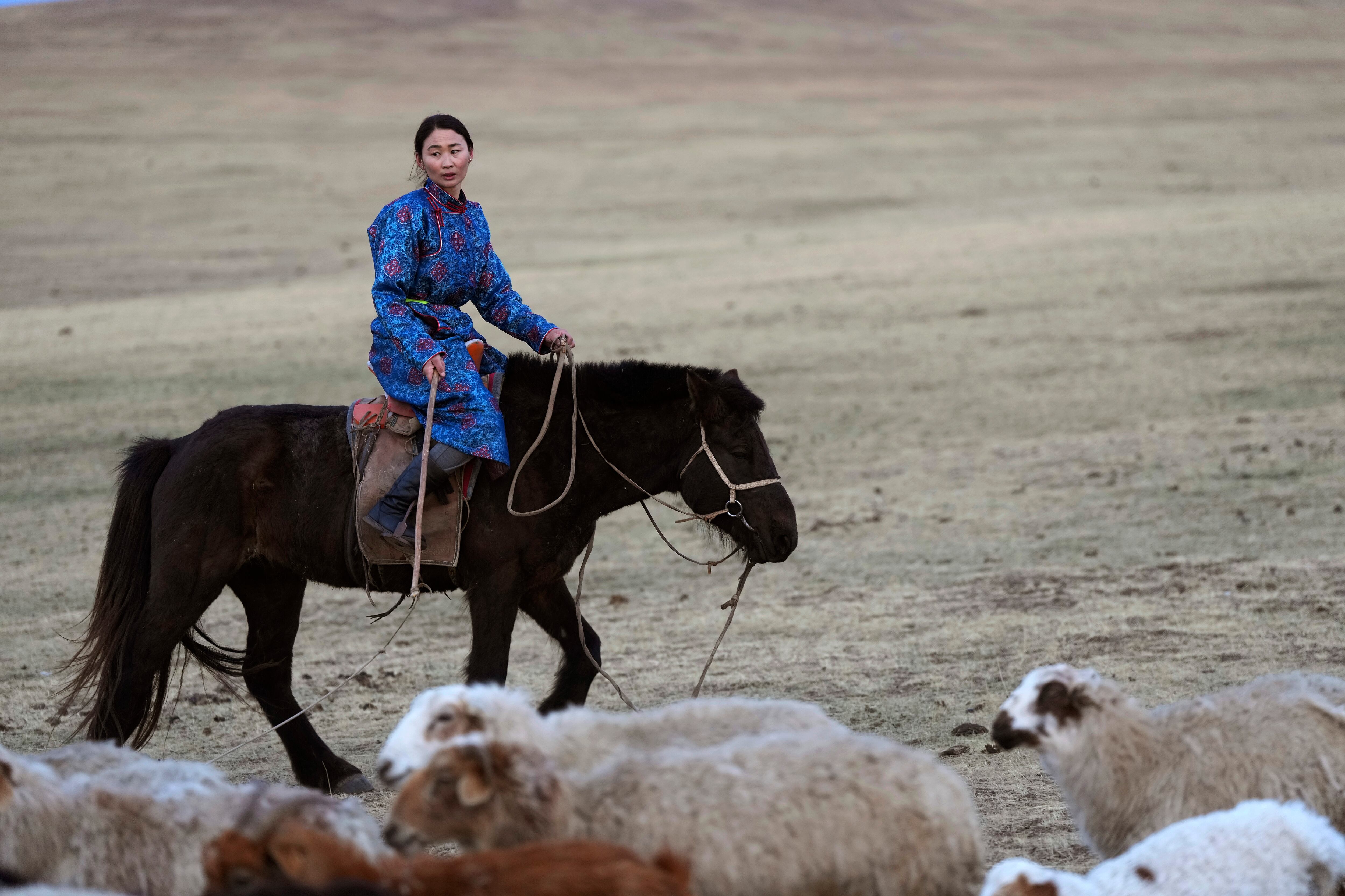 A caballo, cabalgó hasta un pozo junto con casi mil ovejas y cabras. De vez en cuando, él y su esposa, Nurmaa, se detenían para ayudar a las crías jóvenes que pasaban dificultades, débiles tras un duro invierno, colocando a a un cordero en la cálida comodidad de una camioneta y alimentando a mano a un potro rechazado por su madre. Los animales necesitarían fortaleza para el viaje hacia el este a través de vastos pastizales en medio de colinas.