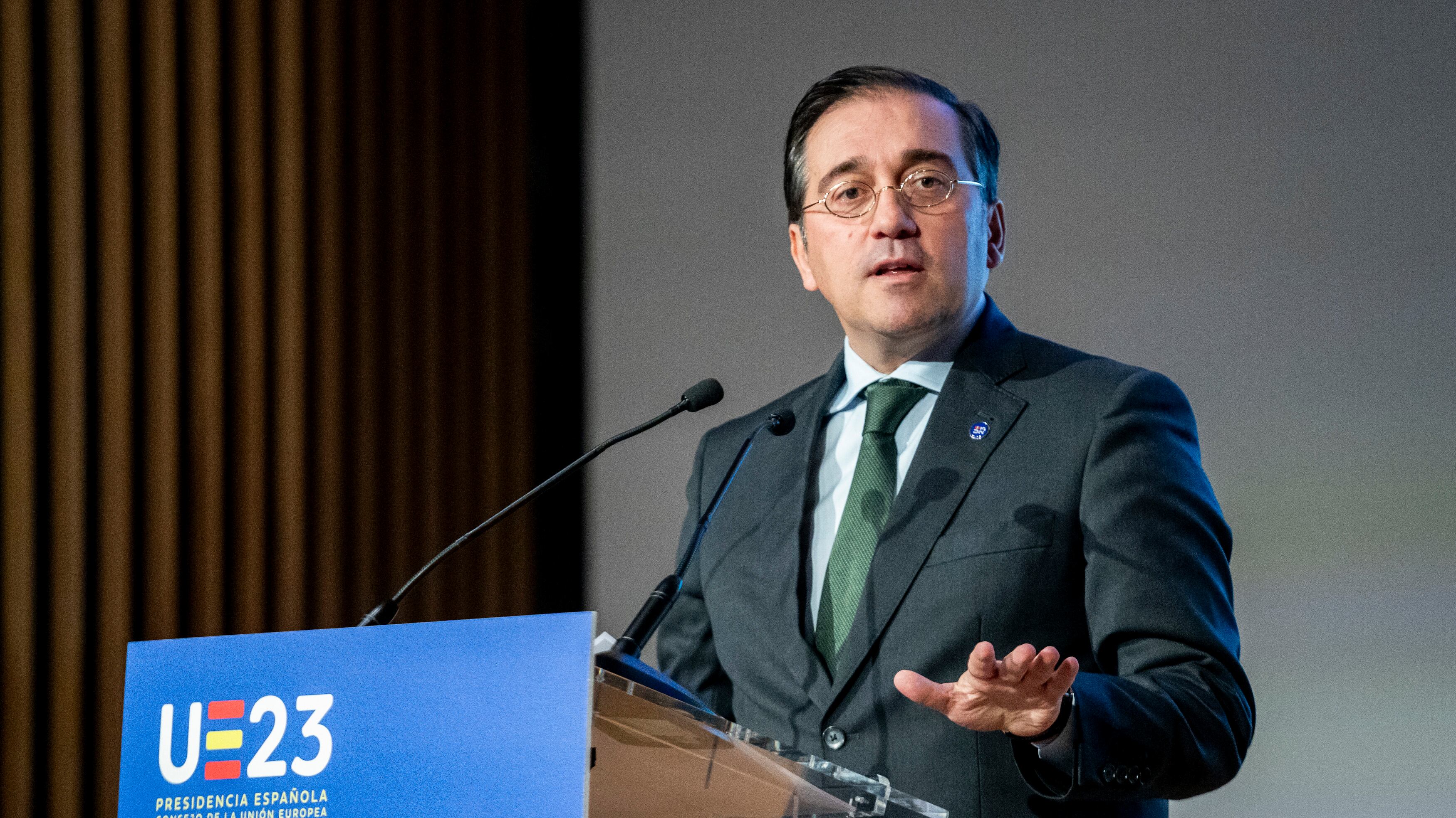 El ministro de Asuntos Exteriores, Unión Europea y Cooperación, José Manuel Albares, presenta el sello de correos UE 2023, en el Palacio Marqués de Salamanca, a 23 de noviembre de 2023, en Madrid (España). El sello está dedicado a la Presidencia esp A. Pérez Meca - Europa Press (A. Pérez Meca - Europa Press/Europa Press)