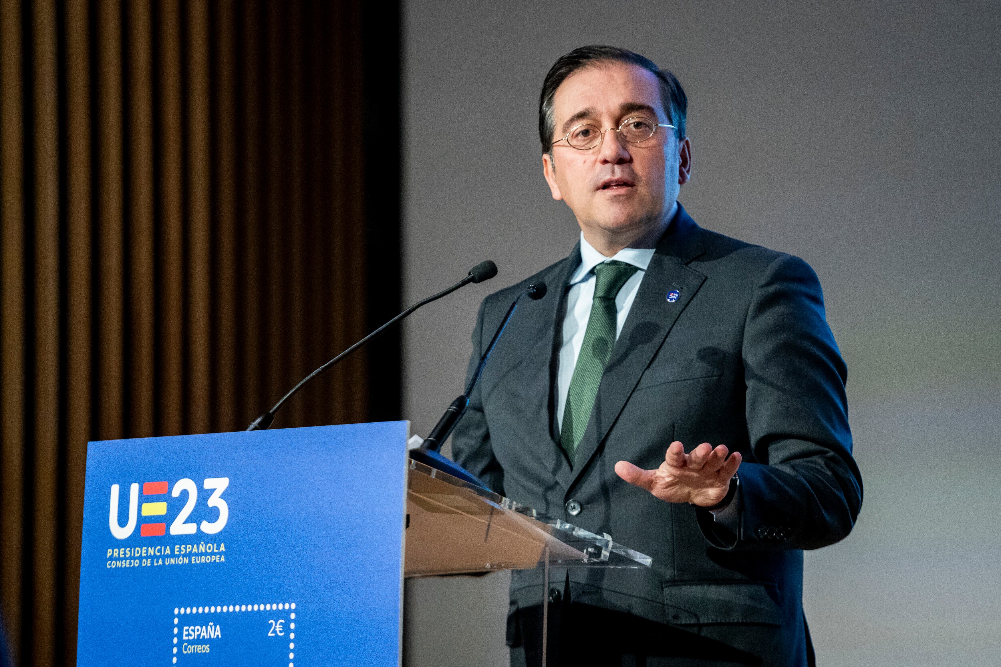 El ministro de Asuntos Exteriores, Unión Europea y Cooperación, José Manuel Albares, presenta el sello de correos UE 2023, en el Palacio Marqués de Salamanca, a 23 de noviembre de 2023, en Madrid (España). El sello está dedicado a la Presidencia esp A. Pérez Meca - Europa Press (A. Pérez Meca - Europa Press/Europa Press)