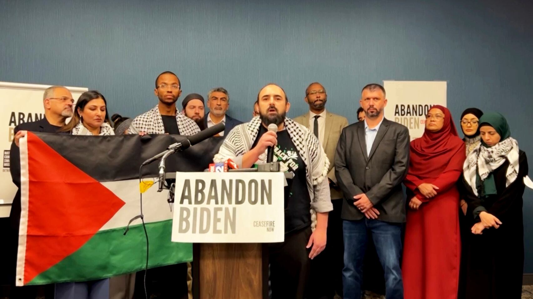 Dirigentes de Michigan, Minnesota, Arizona, Wisconsin, Florida, Georgia, Nevada y Pensilvania se reunieron tras un atril en que se leía “Abandona a Biden, alto el fuego ya” en Dearborn, Michigan, la ciudad con mayor concentración de estadounidenses de origen árabe de Estados Unidos.