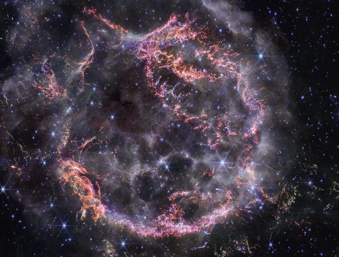 Los colores más notables en la imagen más nueva de Webb son grupos de naranja brillante y rosa claro que conforman la capa interna del remanente de supernova. La visión afilada de Webb puede detectar los nudos de gas más pequeños, compuestos de azufre, oxígeno, argón y neón de la propia estrella. Incrustado en este gas hay una mezcla de polvo y moléculas, que eventualmente se incorporará a nuevas estrellas y sistemas planetarios. Algunos filamentos de los escombros son demasiado pequeños para resolverse, incluso por Webb, lo que significa que son comparables o menos de 16.000 millones de km (alrededor de 100 unidades astronómicas). En comparación, la totalidad de CAS A abarca 10 años luz, o aproximadamente 96 billones de km.