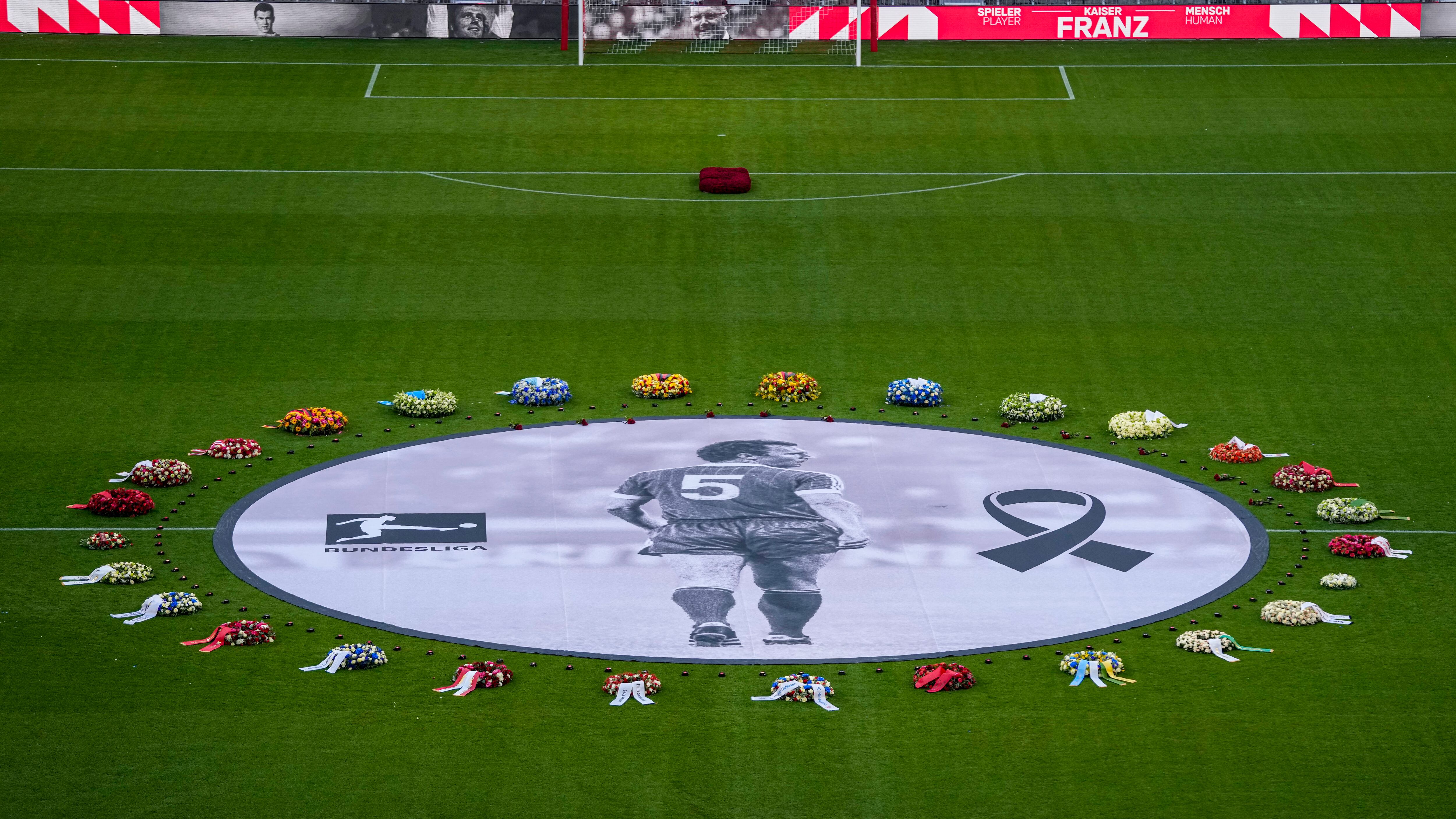 Una fotografía en blanco y negro de Beckenbauer cubrió el circulo central del campo, rodeado de guirnaldas en el memorial que incluyó tributos de clubes como el Barcelona y Liverpool.