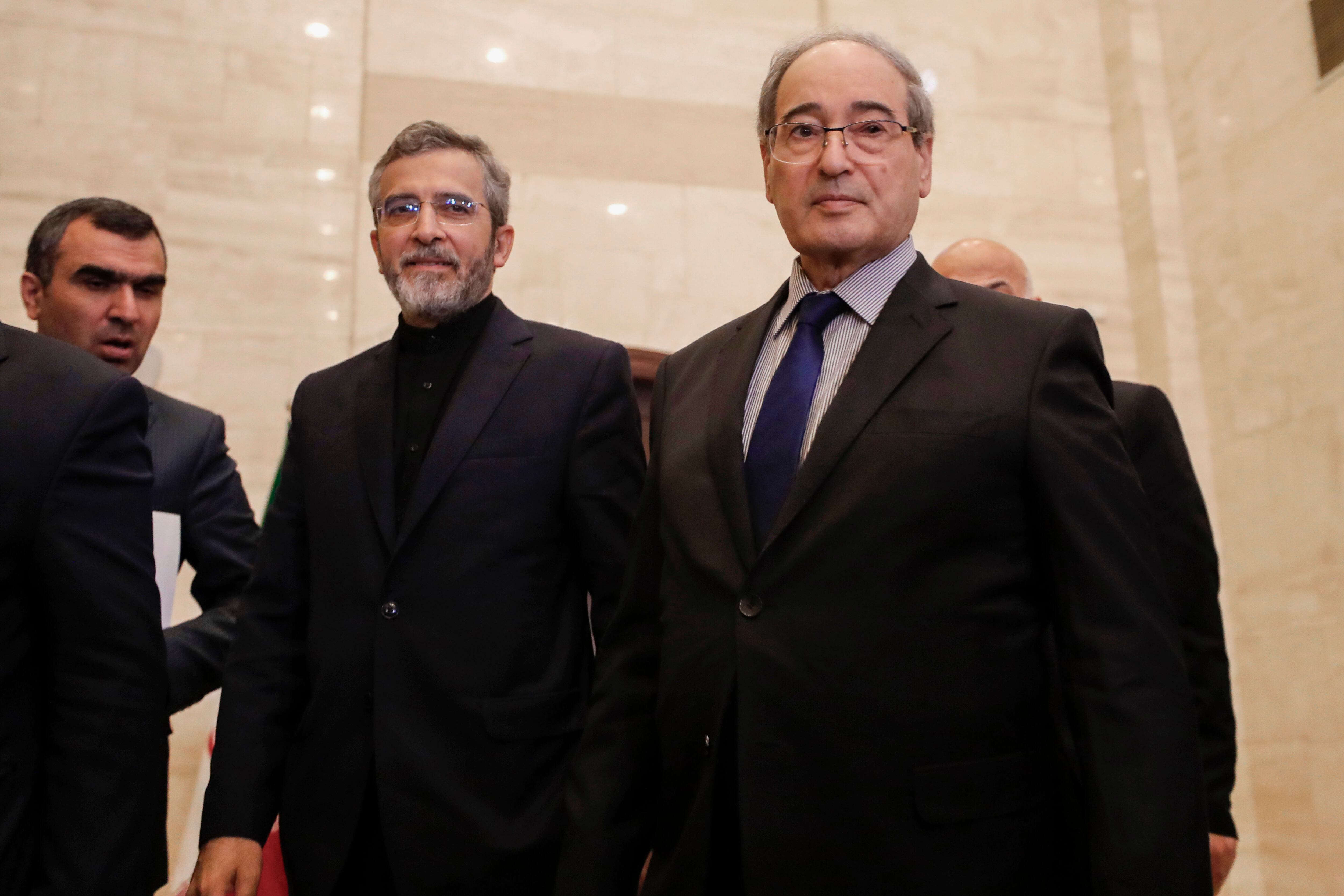 El canciller sirio Faisal Mekdad (der) con el canciller iraní Ali Bagheri Kani (cent) en Damasco, Siria, el 4 de junio de 2024.. (Foto AP/Omar Sanadiki) AP (Omar Sanadiki/AP)
