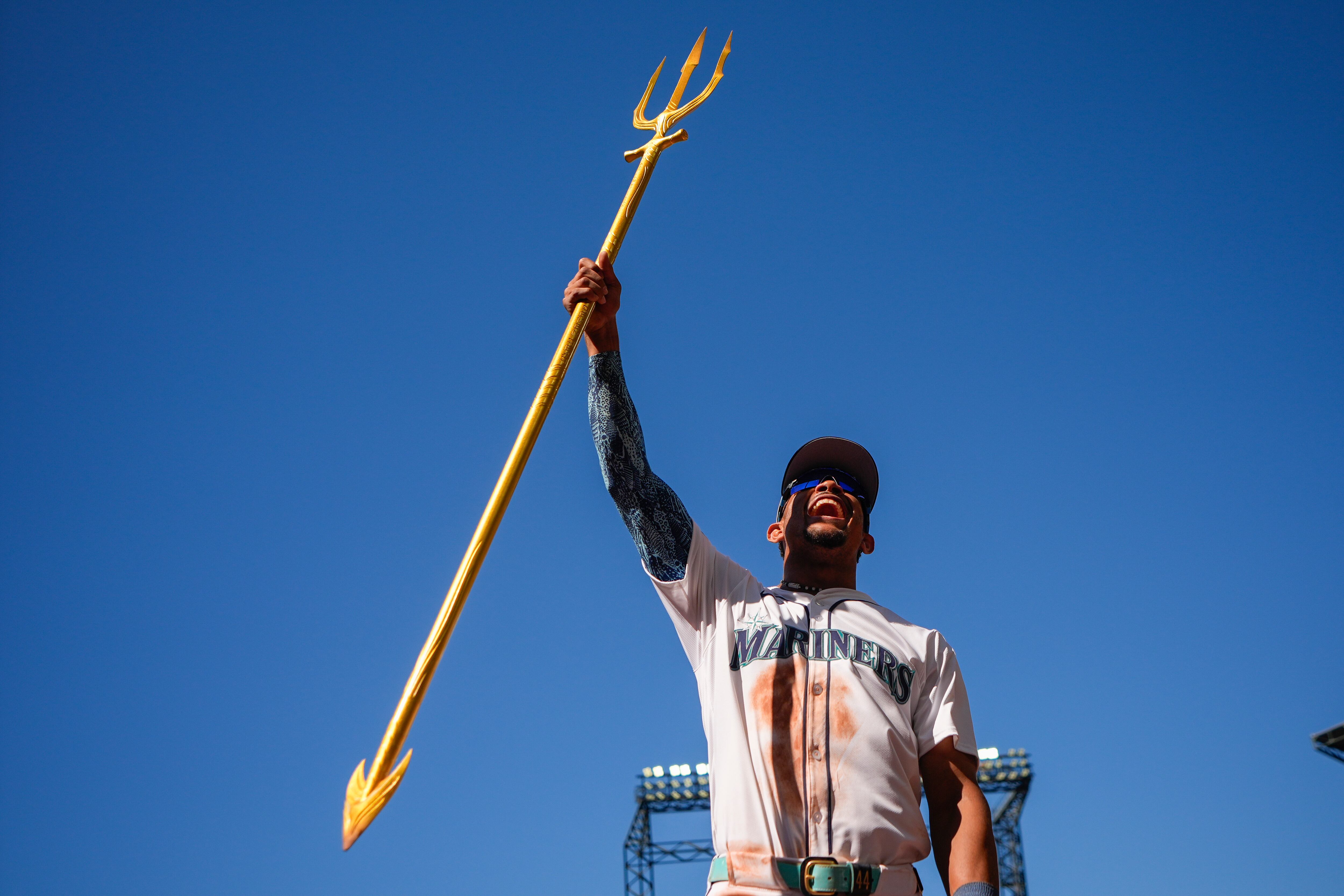 El dominicano Julio Rodríguez, de los Marineros de Seattle, levanta un tridente para festejar la victoria sobre los Orioles de Baltimore, el jueves 4 de julio de 2024 (AP foto/Lindsey Wasson) AP (Lindsey Wasson/AP)