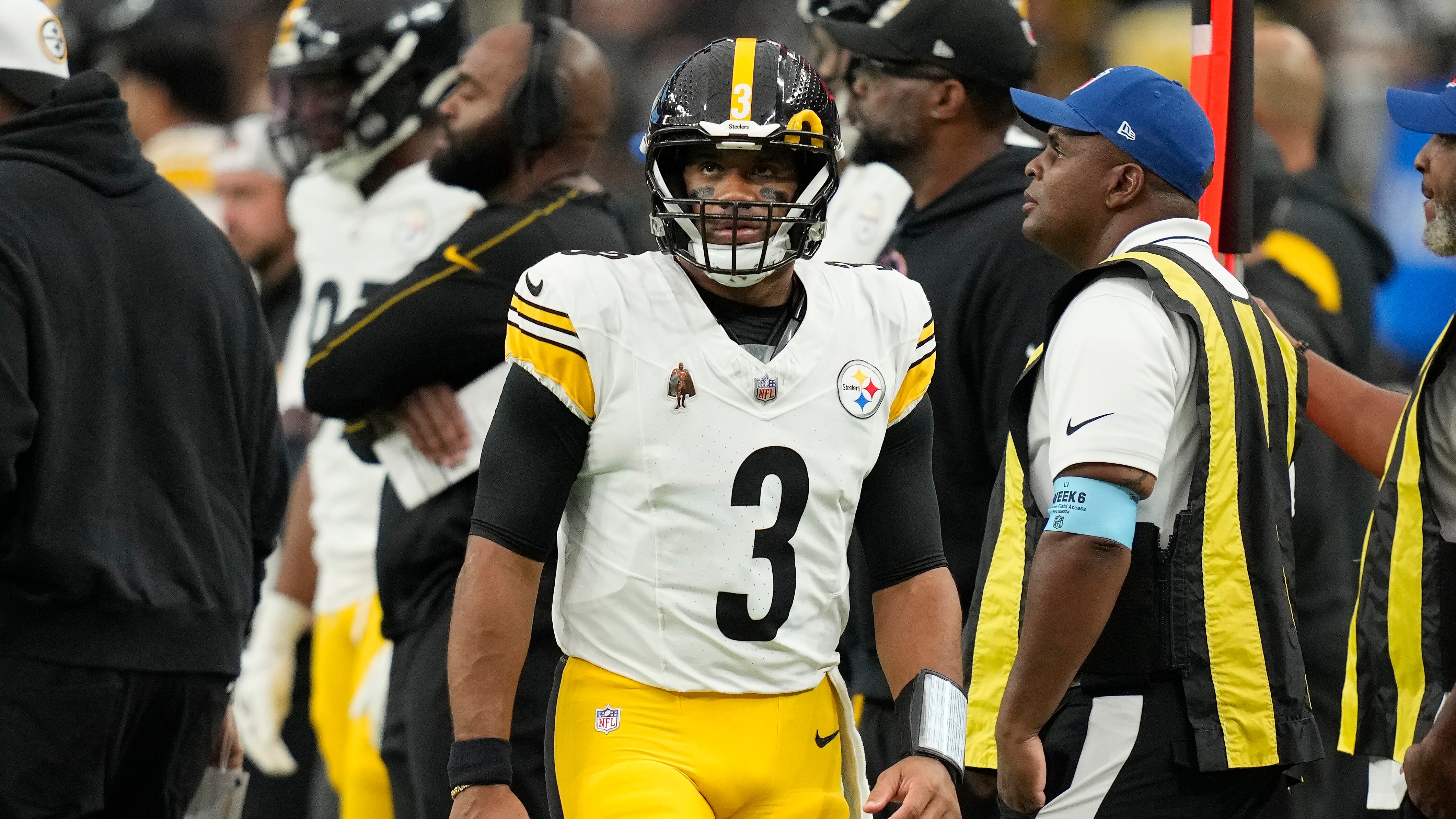 Russell Wilson Russell Wilson (3), quarterback de los Steelers de Pittsburgh, camina en la banda del equipo durante la segunda mitad del partido de la NFL en contra de los Raiders de Las Vegas, el domingo 13 de octubre de 2024. (AP Foto/John Locher) (John Locher/AP)