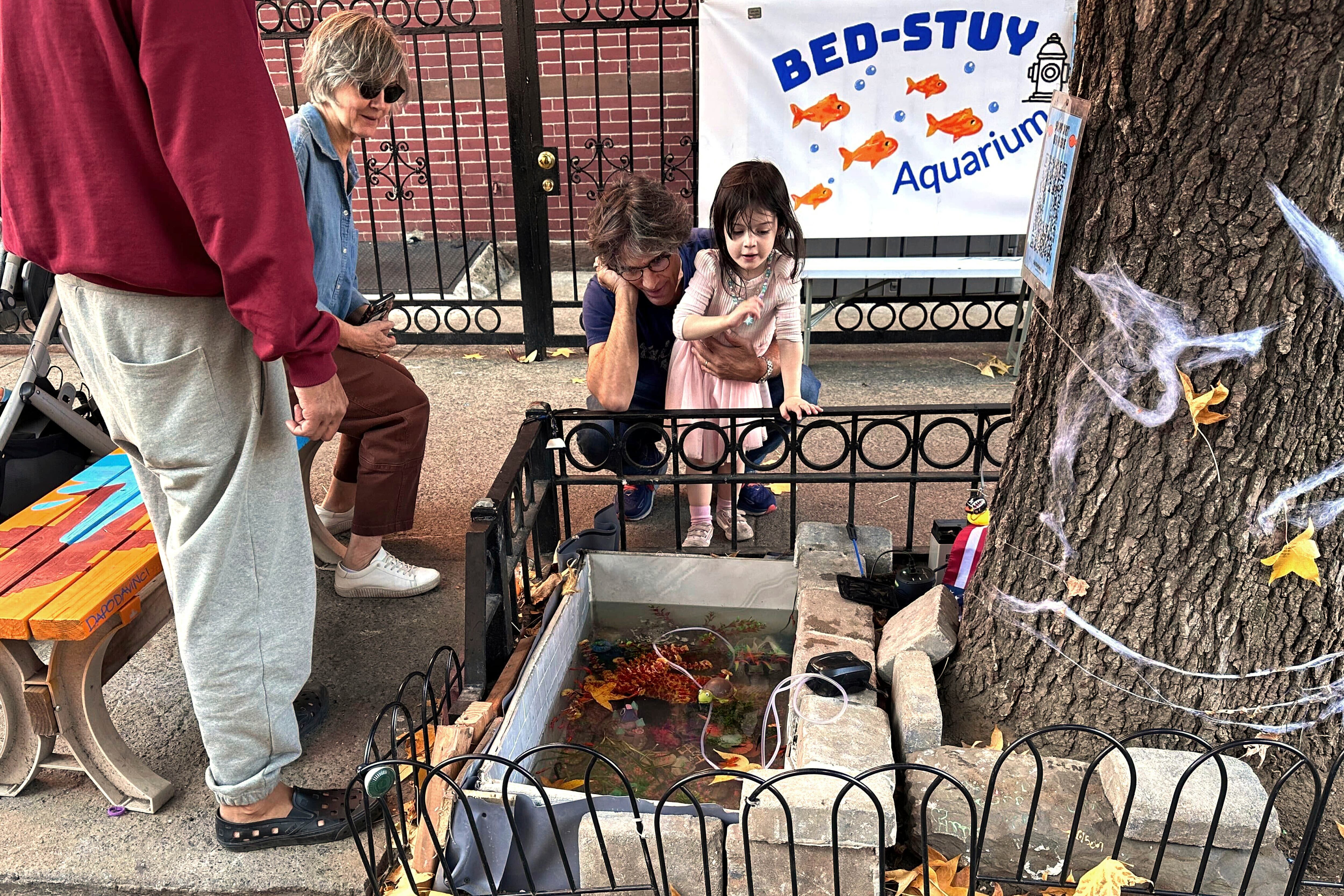 Incluso hay un letrero diseñado para imitar una placa oficial del Departamento de Parques de la Ciudad de Nueva York, fijado al árbol, en el cual se lee: “Acuario de BedStuy”.