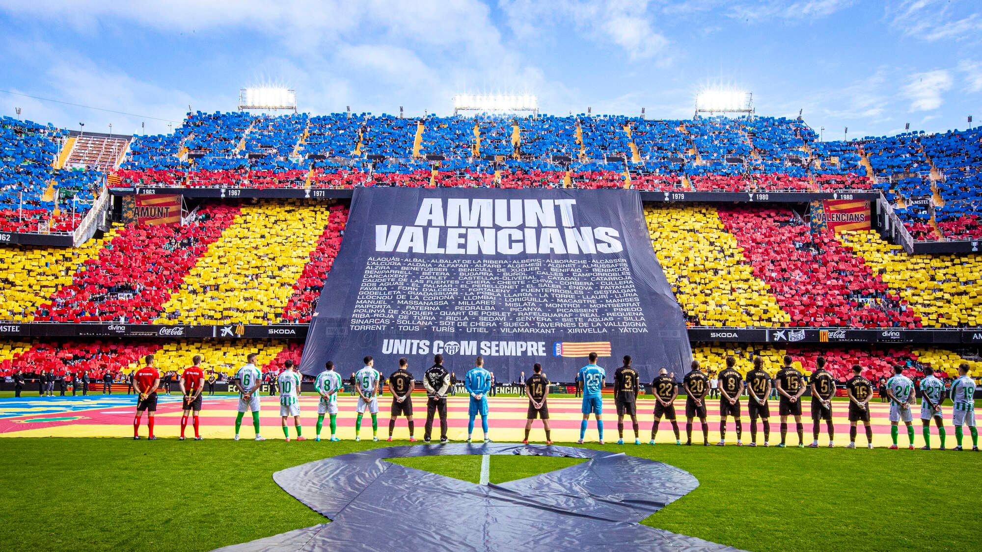 Los 22 futbolistas y los árbitros portaron un enorme crespón negro que depositaron en el césped en memoria de todos los fallecidos. Tras ello, sonó el himno de la Comunitat Valenciana, con tabalet y dolçaina, mientras los aficionados guardaban un silencio que rompió una sonora ovación.