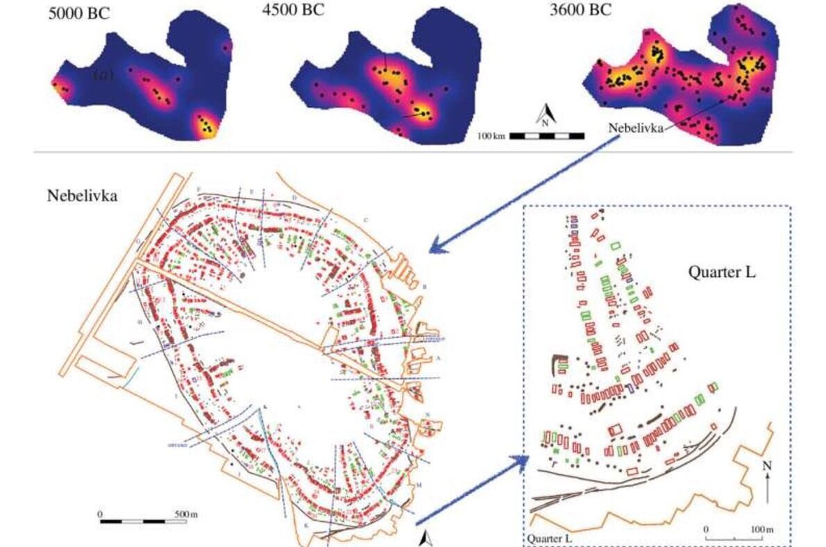 Se centraron en un asentamiento llamado Nebelivka, en lo que hoy es Ucrania, donde miles de casas de madera estaban espaciadas regularmente en patrones concéntricos y agrupadas en barrios.