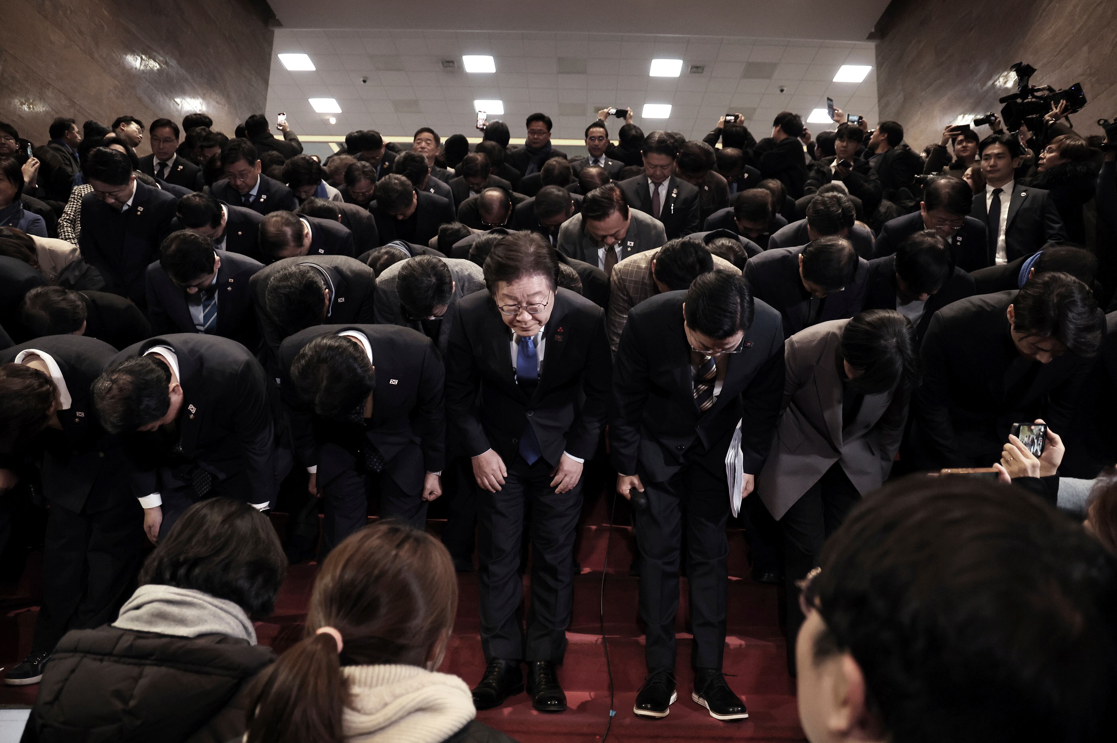 Lee Jae-myung, líder del Partido Democrático de Corea del Sur (abajo en el centro), y los miembros de su partido se inclinan ante la Asamblea Nacional en Seúl, Corea del Sur, después de que el Parlamento surcoreano votara a favor de una moción para d AP (Kim Ju-hyung/AP)