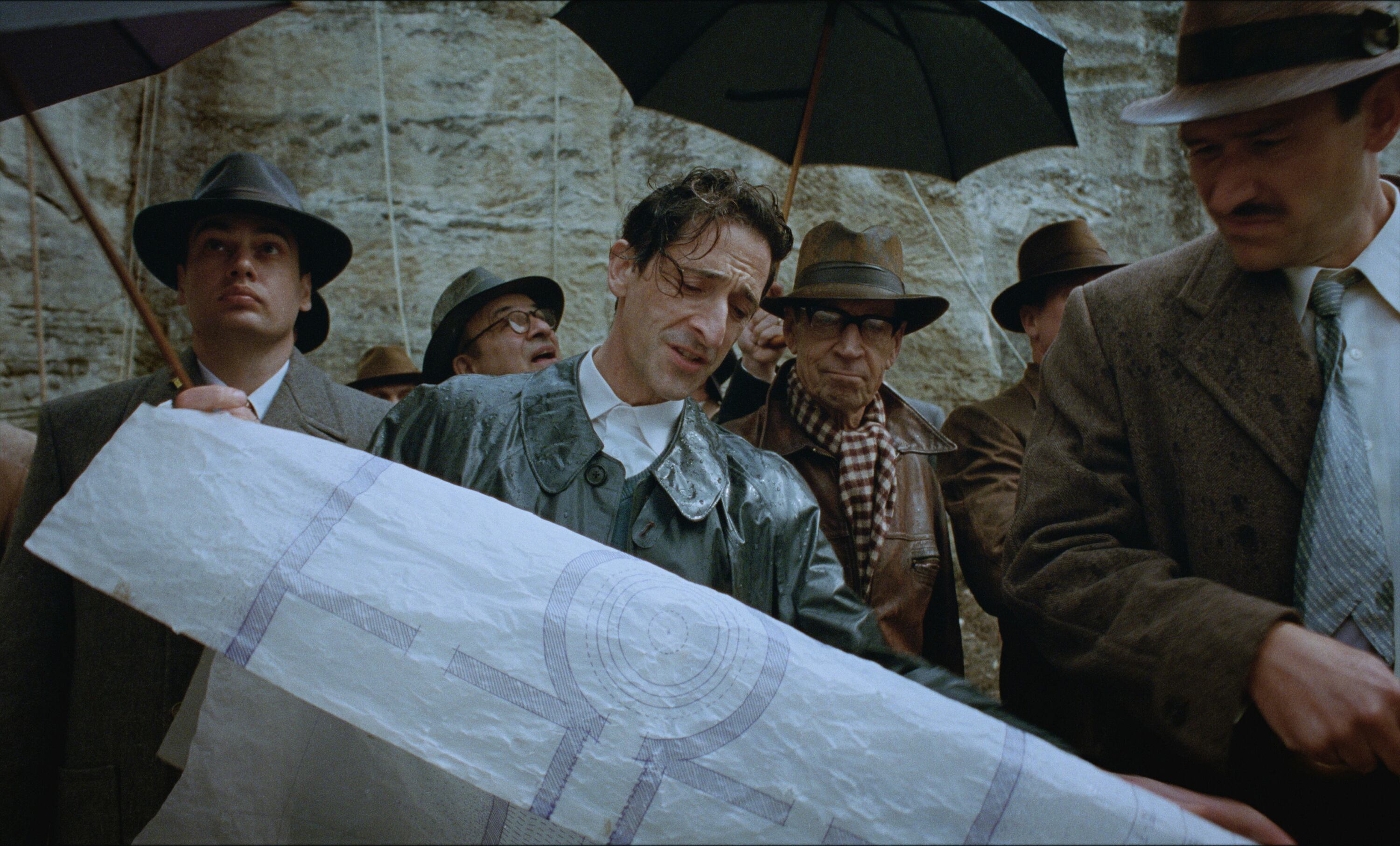 Sin mezclar nuestras metáforas artísticas, es justo decir que una historia como esta necesita un lienzo bastante grande. Corbet, trabajando con la coguionista Mona Fastvold, definitivamente se da eso, filmando en VistaVision, con su amplio campo de visión; dividiendo su película en movimientos como una sinfonía; y finalmente, permitiéndose unas colosales tres horas y 35 minutos, incluyendo un intermedio. Los paralelos con la arquitectura aquí parecen claras. Construir un edificio, o hacer una película — si estás pensando en algo pequeño, vete a casa.