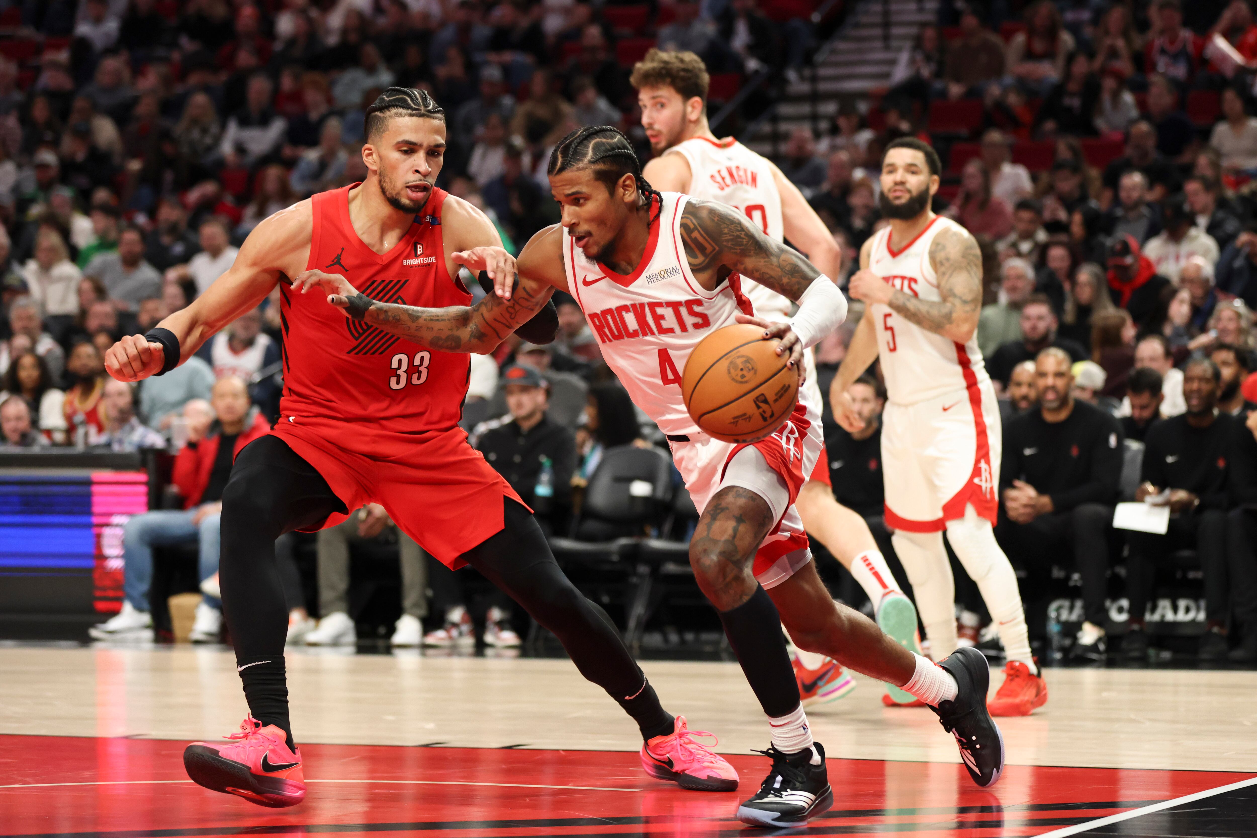 Los Rockets lideraron por hasta nueve puntos al principio, pero Anfernee Simons encestó un triple que puso a los Blazers arriba 31-29 a mitad del segundo cuarto. Houston mantuvo una ventaja de 51-50 al medio tiempo.