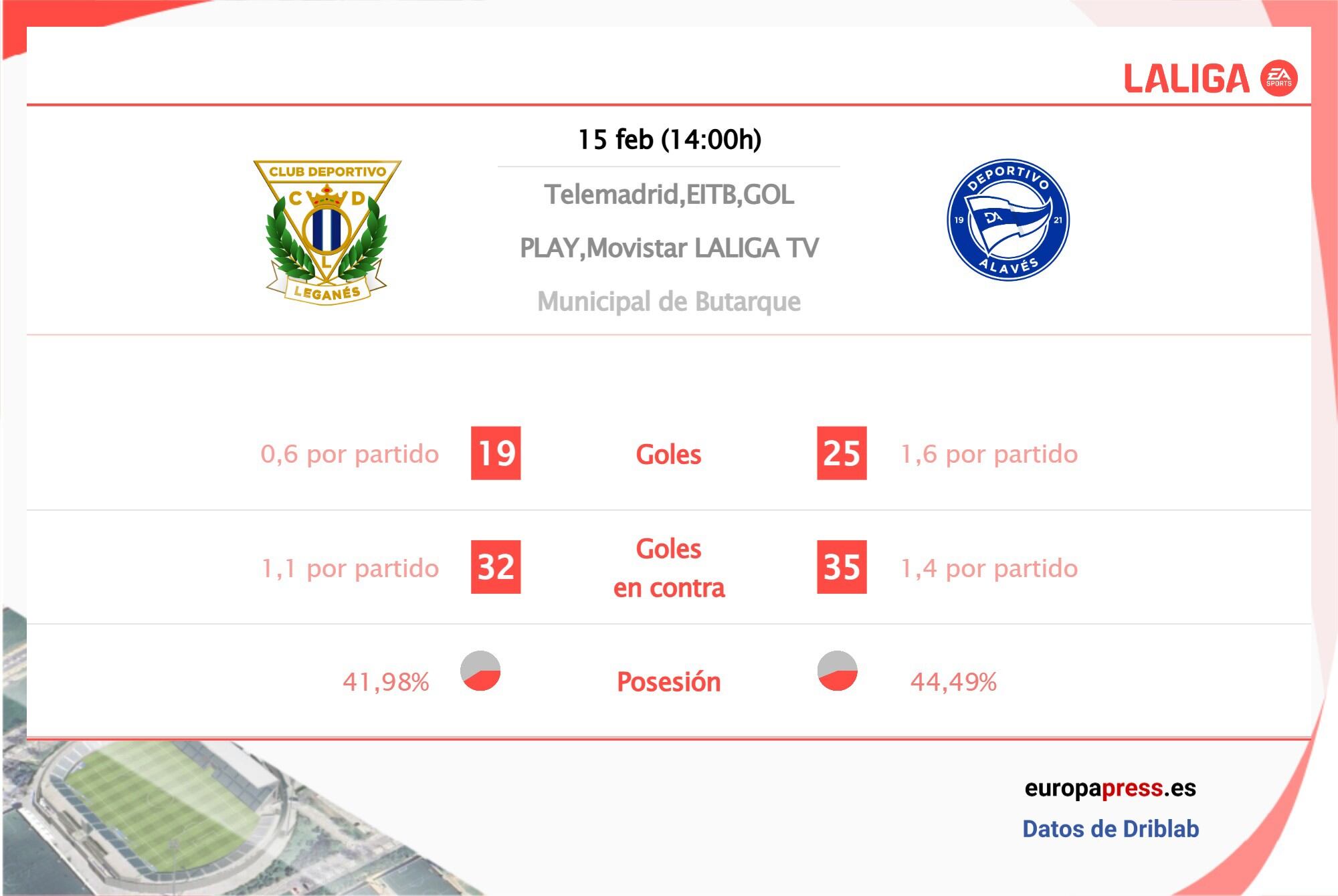 De media, el Leganés ha encajado 1,4 goles y 7,4 disparos por partido por los 1,5 goles y 8,4 disparos que recibe el Deportivo Alavés.