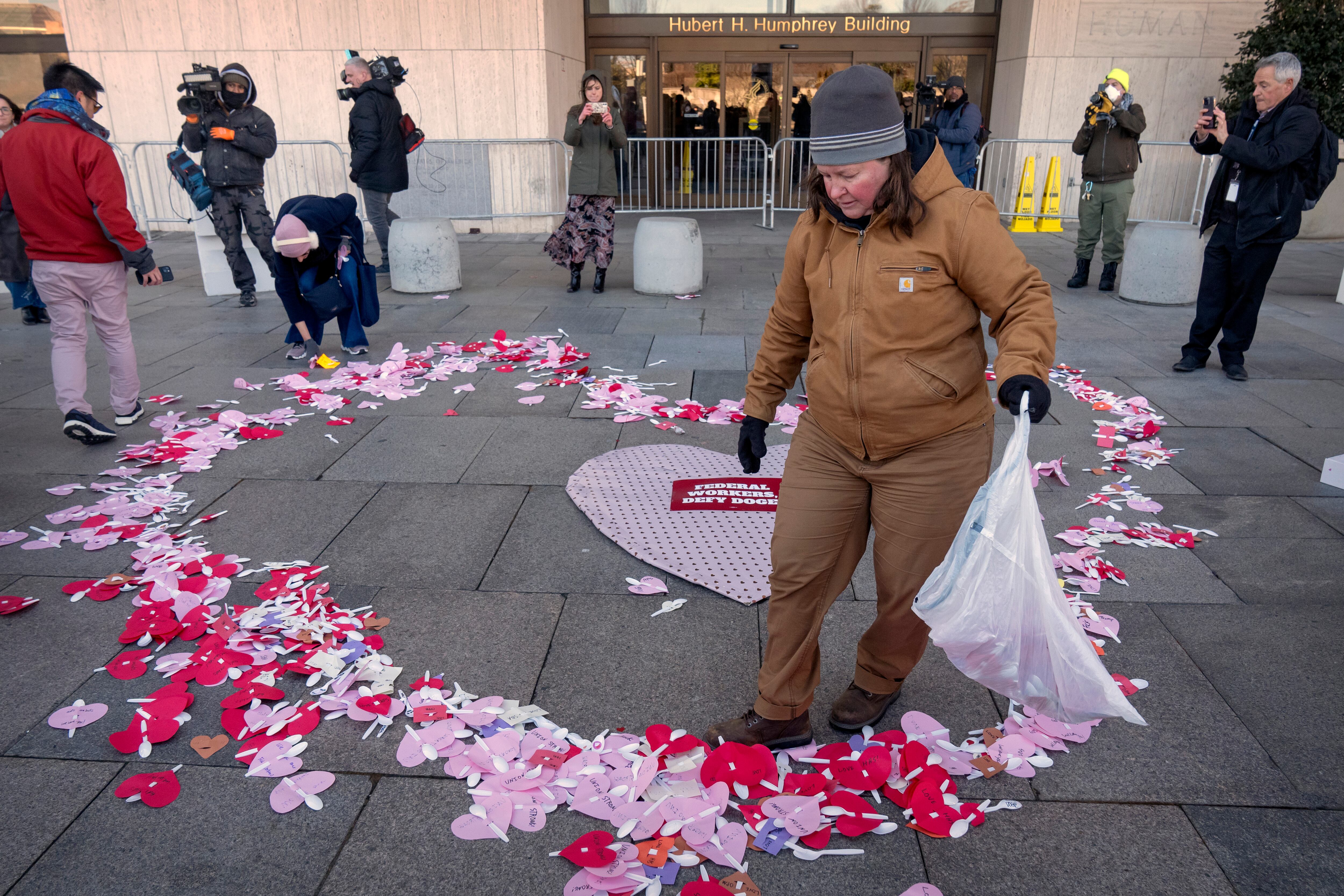Manifestantes en apoyo de los trabajadores federales colocan mensajes por el Día de San Valentín dirigidos a ellos afuera del Departamento de Salud y Servicios Humanos, el viernes 14 de febrero de 2025, en Washington. (AP Foto/Mark Schiefelbein) AP (Mark Schiefelbein/AP)