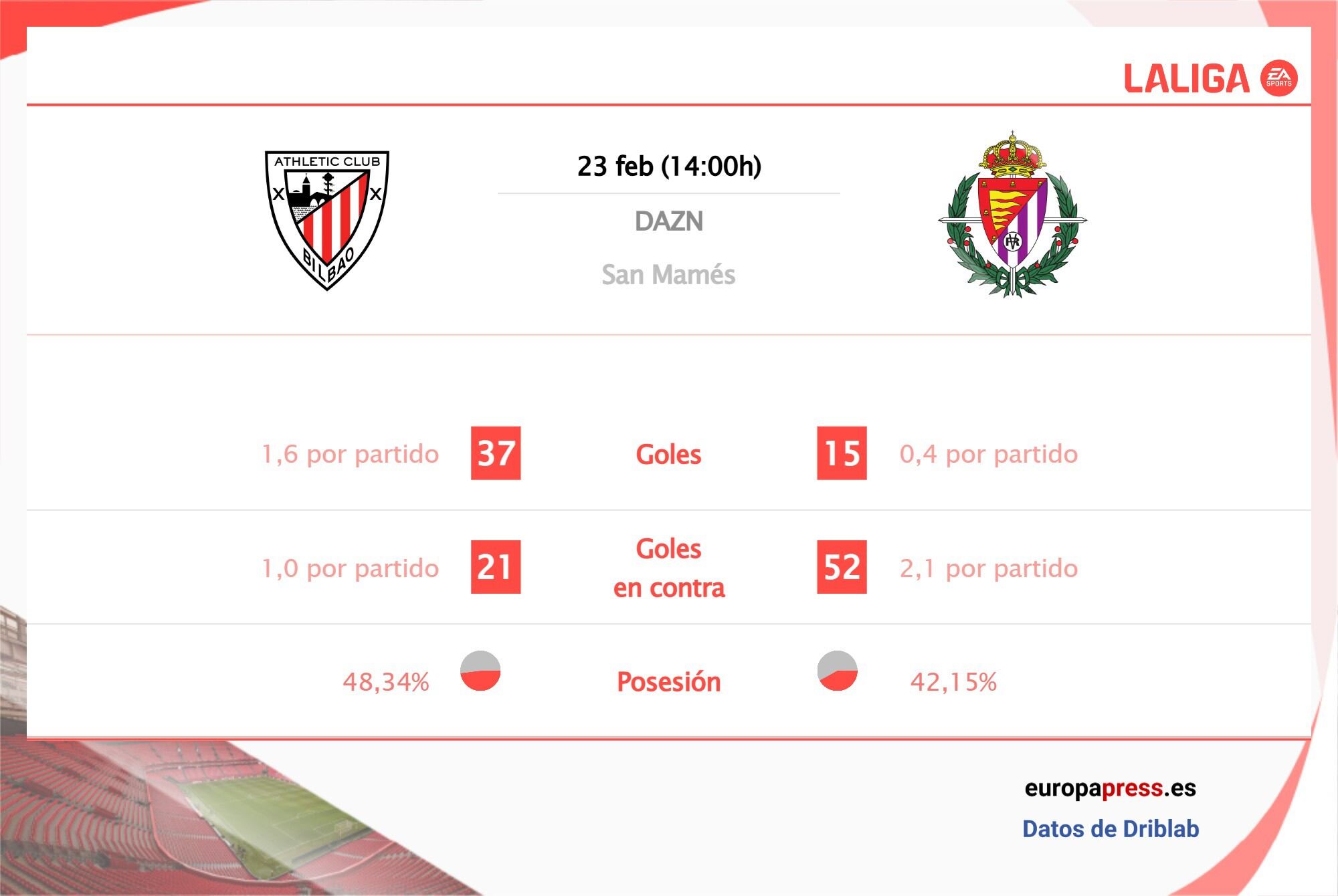 En el apartado ofensivo, el equipo vizcaíno supera al pucelano en goles por partido con 1,5 goles por encuentro del primero frente a 0,6 del segundo, según las estadísticas de Driblab consultadas por Europa Press. En cuanto a la calidad de las ocasiones de gol generadas, los de Valverde también superan al Valladolid con 1,1 goles esperados frente a 0,6.